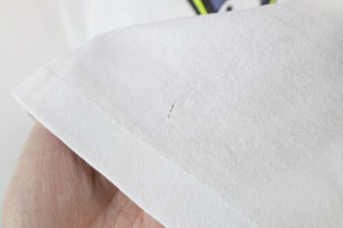 Hole on the front bottom and blemish on the front bottom right. USA made. Graphics faded