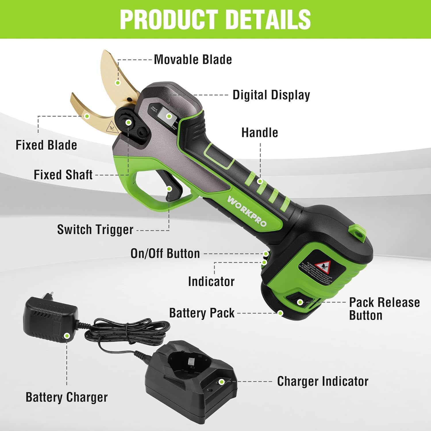 [Dual Cutting Angle Design]: Our electric pruning shears feature two cutting angles with diameters of 0.6inch/15mm and 1inch/25mm, respectively. It can handle branches of different sizes with ease. The maximum cutting diameter of 25mm allows for effortless trimming of wet branches, making your gardening tasks more flexible and efficient. [High-Quality SK5 Blades]: The blades are made from premium SK5 steel, offering exceptional sharpness and durability. This ensures clean and precise cuts every time, enhancing your pruning experience. [Efficient Brushless Motor]: Built-in high-efficiency brushless motor provides powerful performance and a longer lifespan. It runs more quietly and efficiently, making your gardening work more comfortable and hassle-free. [Smart Display Screen]: Equipped with a clear LCD display, it shows real-time cutting counts, battery level, and cutting diameter. This allows you to monitor the pruning progress and device status at any time, preventing unexpected shutdowns and improving work efficiency. [Wide Range of Uses]: This electric branch scissor will be an ideal tool for cutting limbs, pruning branches from trees, making it a great cordless pruning shear for gardens, greenhouses, parks, farms, large pastures, orchards, and more. It can significantly improve your work efficiency by up to 300%. bringing tidiness and beauty to your garden. [Objective]:WORKPRO is committed to providing you with the best shopping experience possible. If you have any questions or concerns regarding your WORKPRO tools, please feel free to contact us. We are here to assist you at any time and help resolve any issues you may encounter.