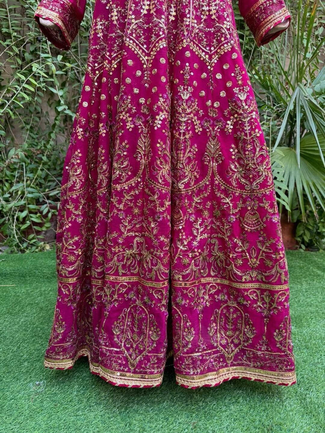 Pakistani Hot Pink Long Maxi Style Embroidered Sequins Chiffon Dress,L