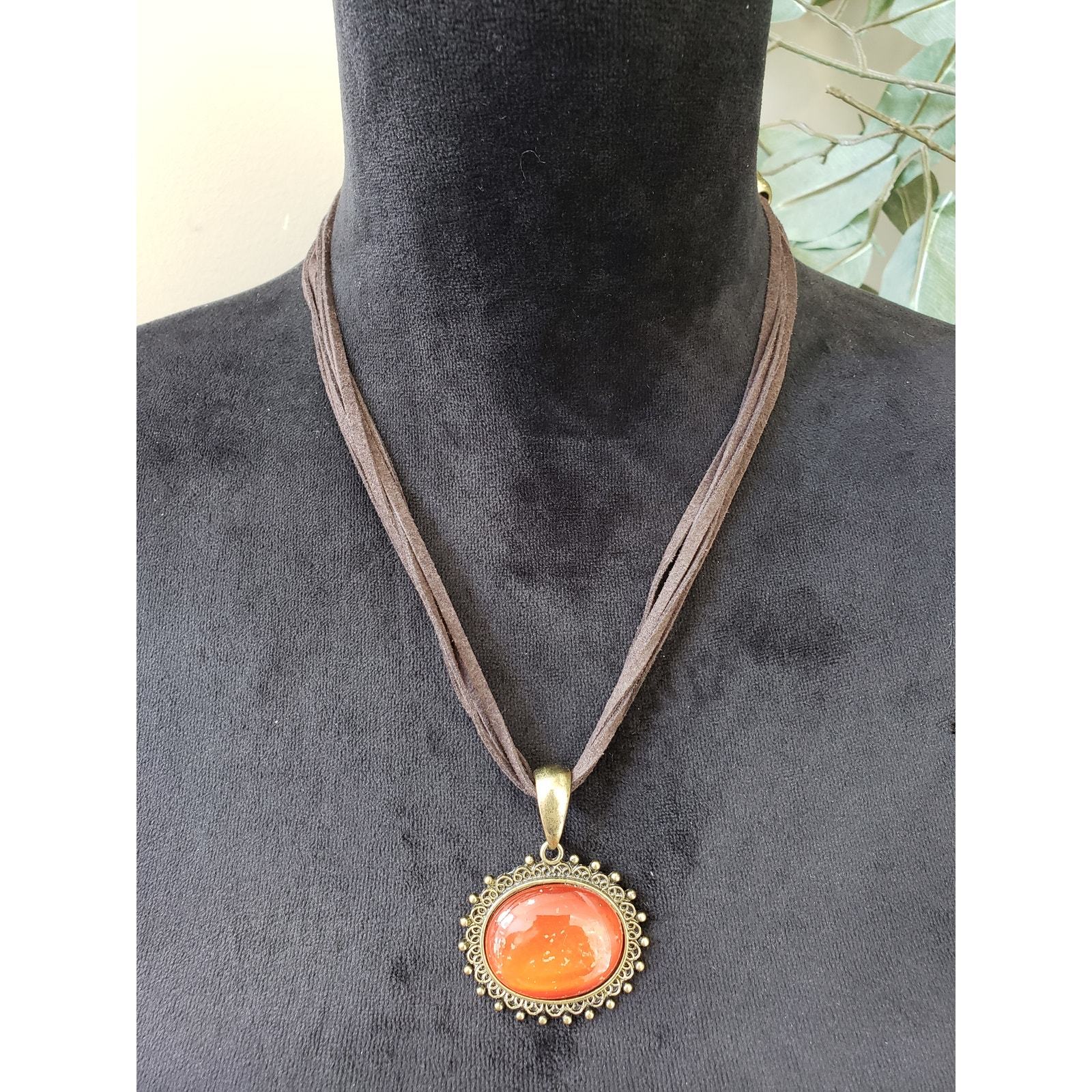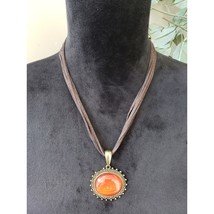 Womens Gold Plated Orange Cabochon Oval Gemstone Suede Cord Pendant Necklace.
