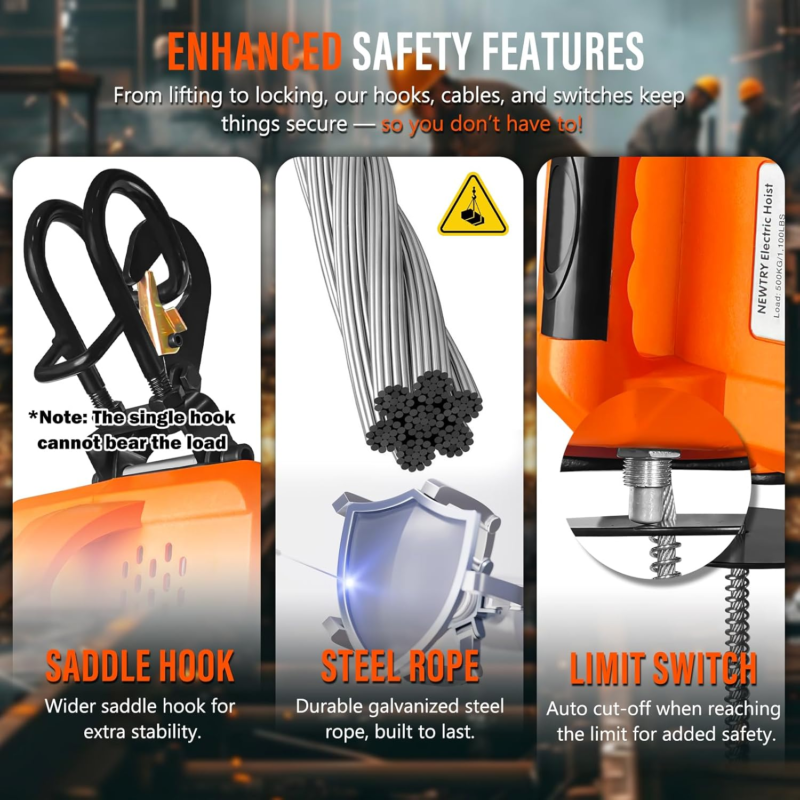 [ENHANCED STRENGTH] ? The hoist features a double hook (saddle hook) with an extended width from 1 inch to 2.2 inches, improving load distribution. Note: the upper single hook is not designed to bear loads. Powered by a robust 1600W universal motor, this 25lbs electric hoist can efficiently lift up to 1,100lbs, though it may produce slightly higher noise levels during operation.
