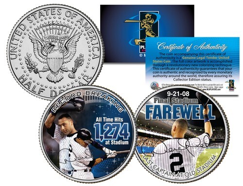 Here is your chance to own a complete set of three (3) colorized JFK Kennedy Half Dollar U.S. Coins featuring DEREK JETER. The 3-coin set includes: a ?DEREK JETER - FINAL SEASON?, ?DEREK JETER ? CAPTAIN? plus a "THE CAPTAIN - NUMBER RETIRED MAY 14, 2017" coin. These high-quality, genuine Legal Tender United States coins have been colorized using a unique painstaking multicolor authentic process by the Merrick Mint. Colorizing coins involves the unique application of special inks directly to the surface of a coin that achieves a level of detail, color saturation, and durability that is #1 in the coin industry. The result is an everlasting colorized coin collectible of ultra-high quality. Each coin comes in a premium coin capsule. The 3-coin set comes with a Certificate of Authenticity to guarantee that your coins are authentic and recognized by every monetary authority around the world, assuring its Collector Edition status.