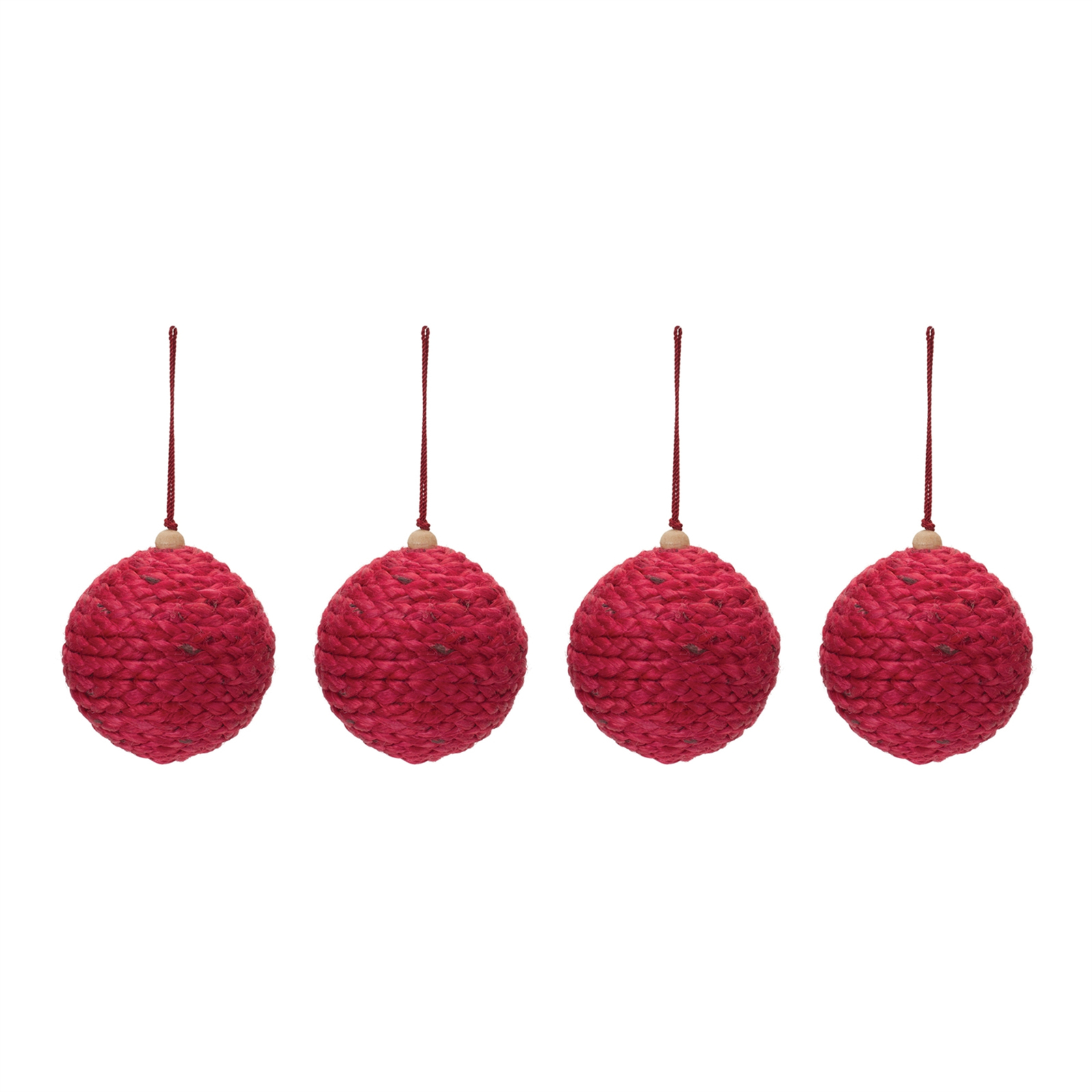 Add a touch of rustic charm to your holiday decor with our Jute Ball Ornaments! This set of vibrant red ornaments features a natural woven jute design accented with beautiful wooden beads, creating a cozy, wintery look that s perfect for any Christmas tree. With a sturdy rope hanger for easy display, these ornaments bring warmth and sparkle to your festive home. A must-have for adding a handmade, festive touch to your indoor space this holiday season. Sold in a set of four matching pieces to create a balanced and versatile display on your Christmas tree.