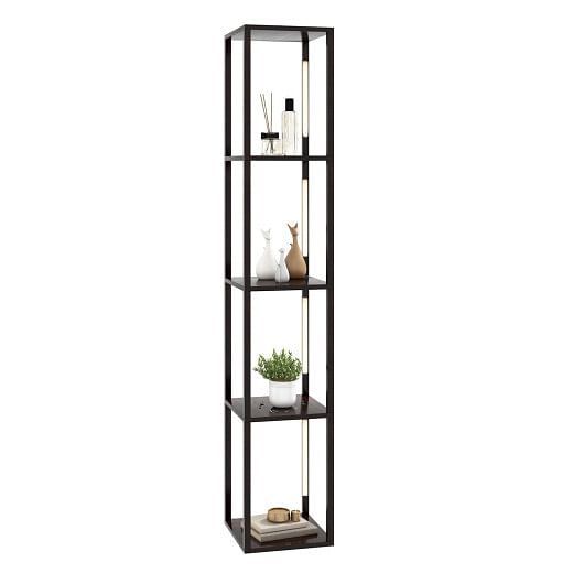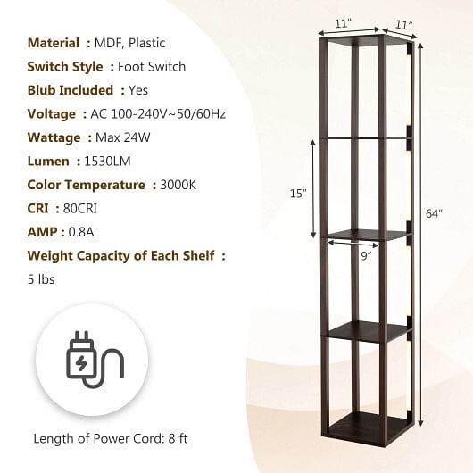 Specifications: Color Black/walnut Color of light Warm white Material MDF plastic Overall dimension 11" x 11" x 64" (L x W x H) Length of power cord 8 ft Net weight 13 lbs Weight capacity of each shelf 5 lbs AMP 0.8A Voltage AC 100-240V~50/60Hz Wattage Max 24W Lumen 1530LM Color temperature 3000K CRI 80CRI Box Qty 1(May vary by batch)