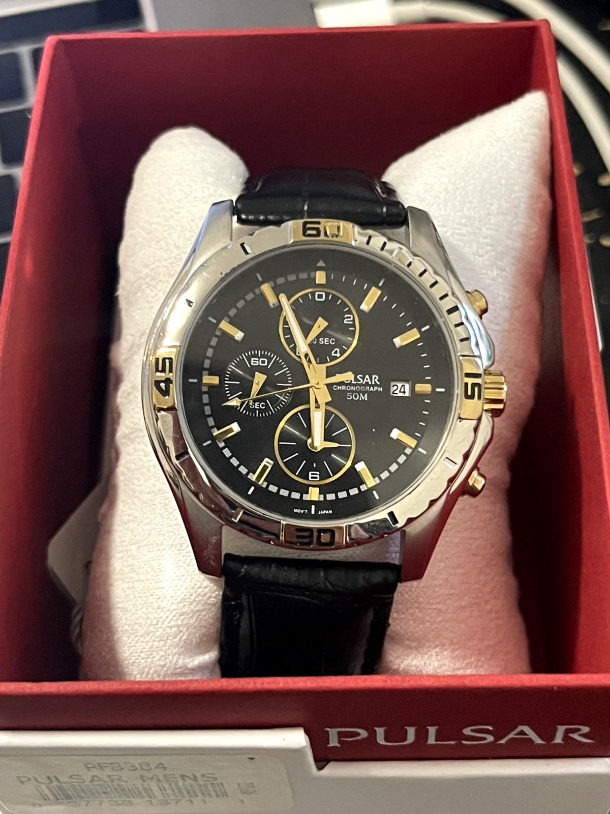 The Pulsar PF8384 men's wristwatch is a stylish chronograph featuring a black dial and matching leather strap. It is powered by a reliable quartz movement, ensuring accurate timekeeping. The sleek design and functional chronograph feature make it a versatile accessory for daily wear or special occasions. With an MSRP of $155, this watch offers great value for those looking for a quality timepiece with a contemporary look.