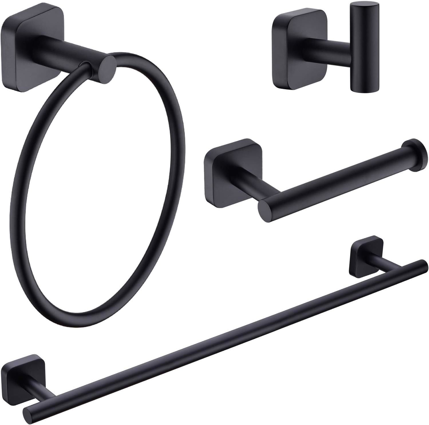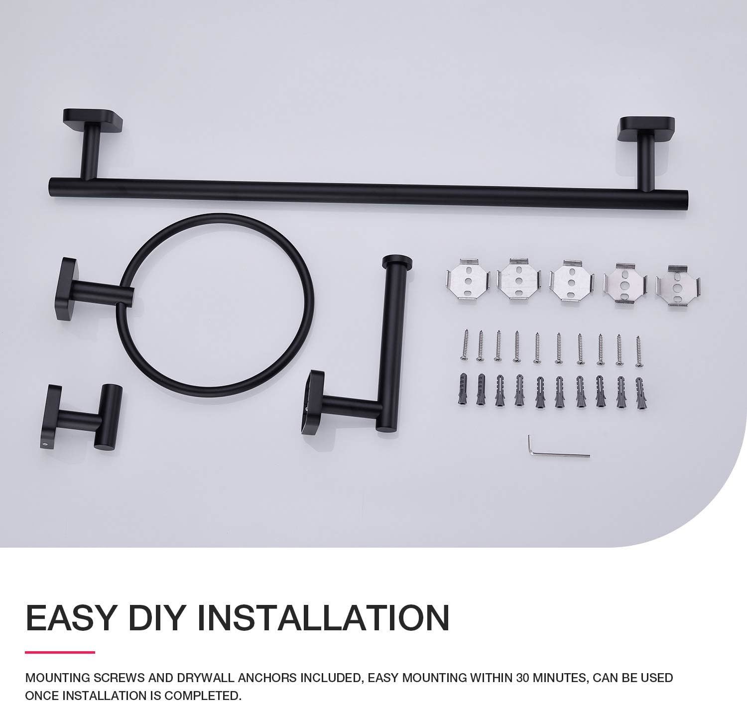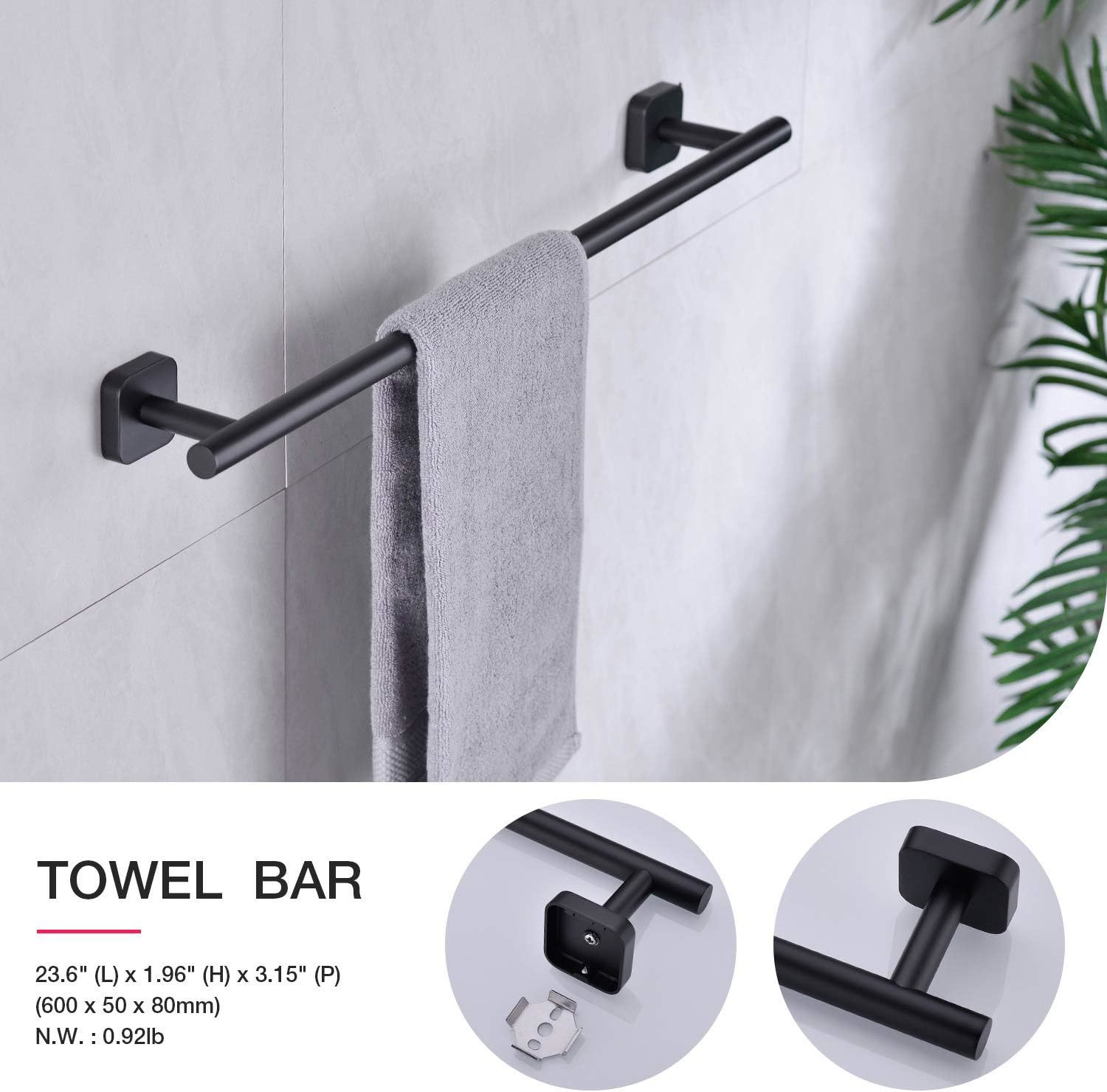 Package Includes - 1 x 23.6" towel bar, 1 x O.D. 7.1" towel ring, 1 x 6.5" toilet roll paper holder, 1 x robe coat hook, and complete mounting accessories Material - Durable sus304 stainless steel construction, non rust and long lasting Design - 4 piece bathroom hardware set, round bar with square mounting base, concise combination, nice appearance Color - Matte Black finish, sleek surface, corrosion and tarnishing resist Easy to Install - Complete mounting screws and wall anchors included, hassle-free installationa, can be used in bathroom, kitchen, bedroom, etc.