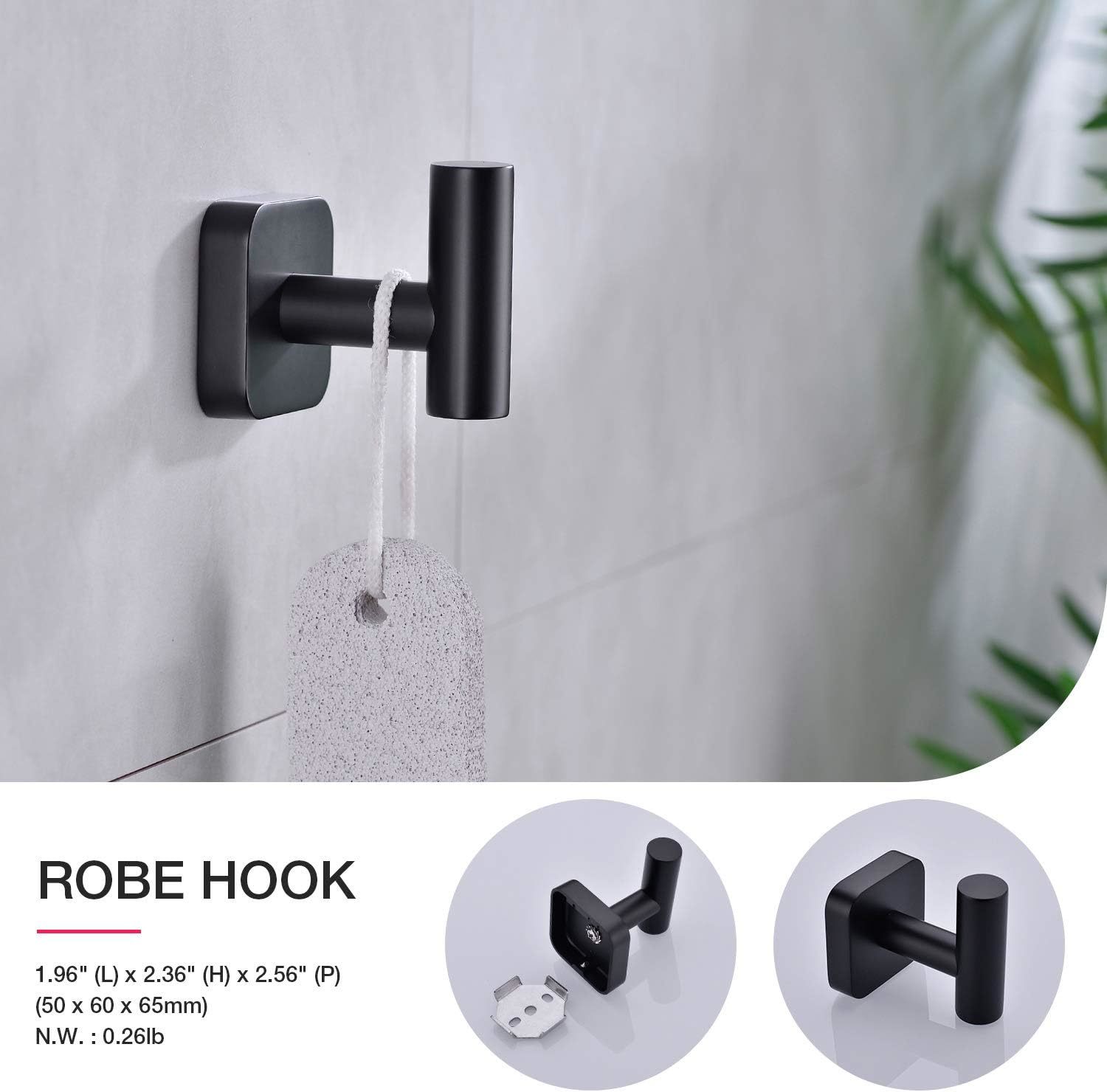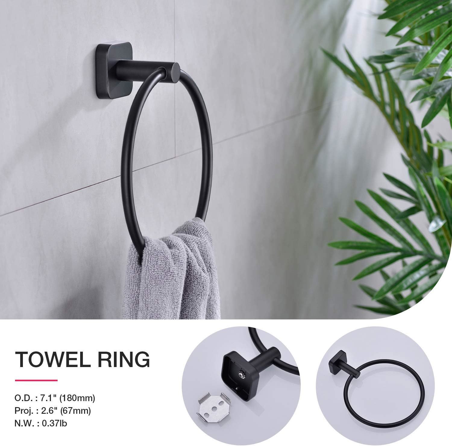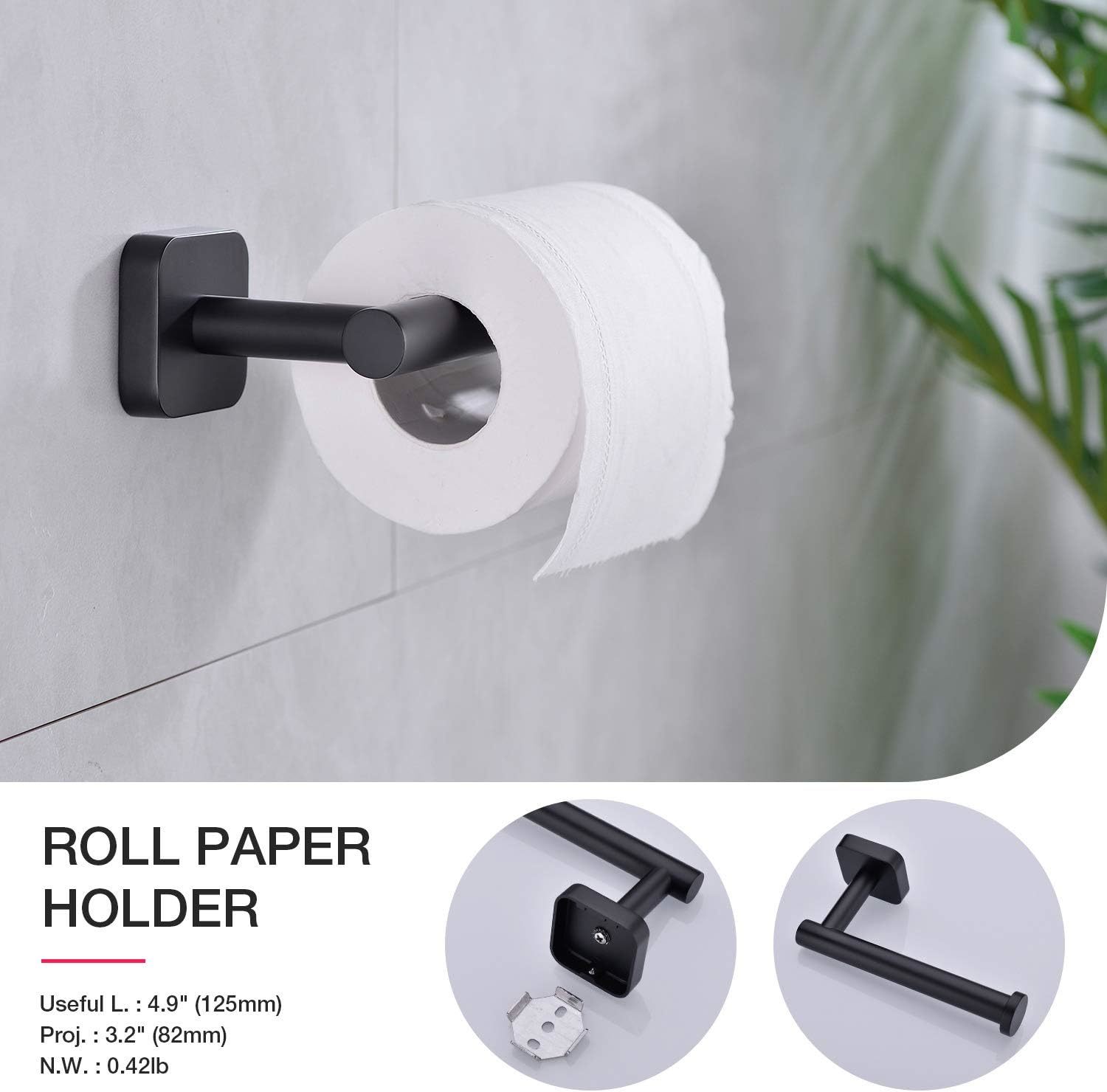 Package Includes - 1 x 23.6" towel bar, 1 x O.D. 7.1" towel ring, 1 x 6.5" toilet roll paper holder, 1 x robe coat hook, and complete mounting accessories Material - Durable sus304 stainless steel construction, non rust and long lasting Design - 4 piece bathroom hardware set, round bar with square mounting base, concise combination, nice appearance Color - Matte Black finish, sleek surface, corrosion and tarnishing resist Easy to Install - Complete mounting screws and wall anchors included, hassle-free installationa, can be used in bathroom, kitchen, bedroom, etc.