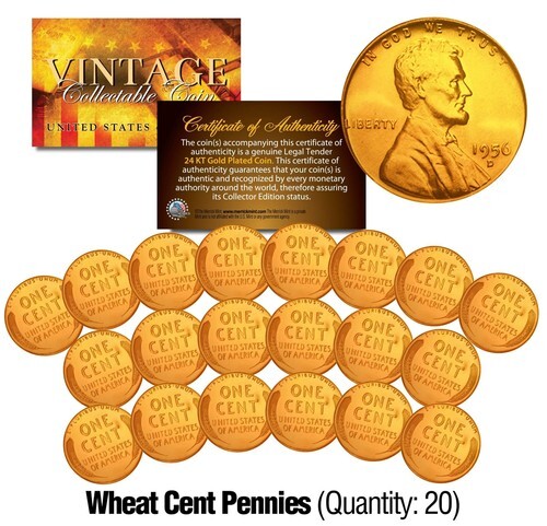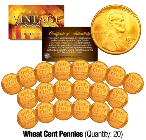 Here is your chance to own a lot of twenty (20) 24KT Gold Plated Lincoln WHEAT CENT U.S. Pennies. Each genuine legal tender U.S. coin is 24KT Gold Plated by the Merrick Mint to highlight the original design using a unique authentic process. The result is an everlasting 24KT Gold Plated coin collectible of ultra-high quality that is #1 in the industry. President Lincoln bust design on the obverse and wheat design on the reverse. The Wheat Cent Penny is a U.S. cent coin with year (1909-1958) and mint marks chosen at random. Coin Capsules NOT included.
