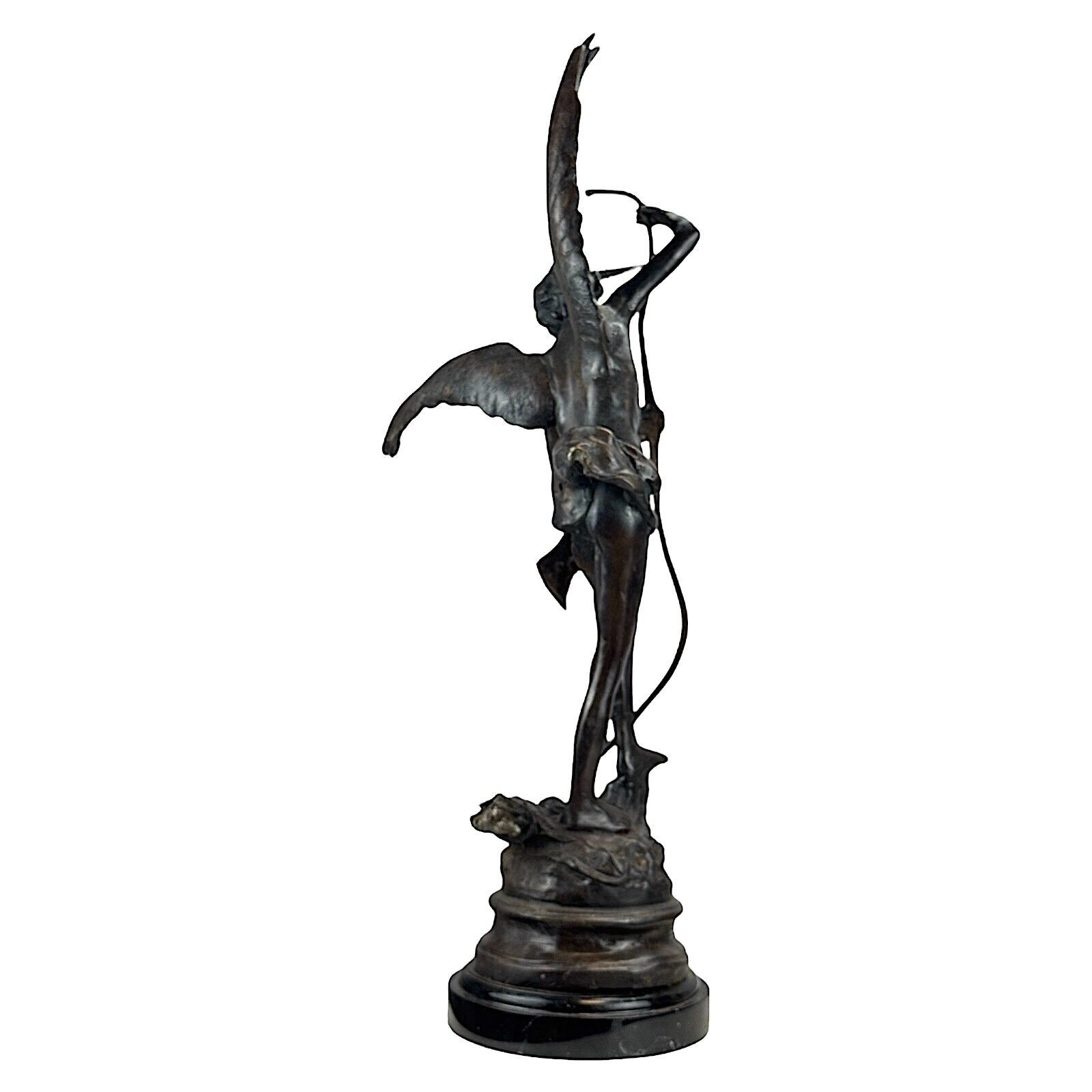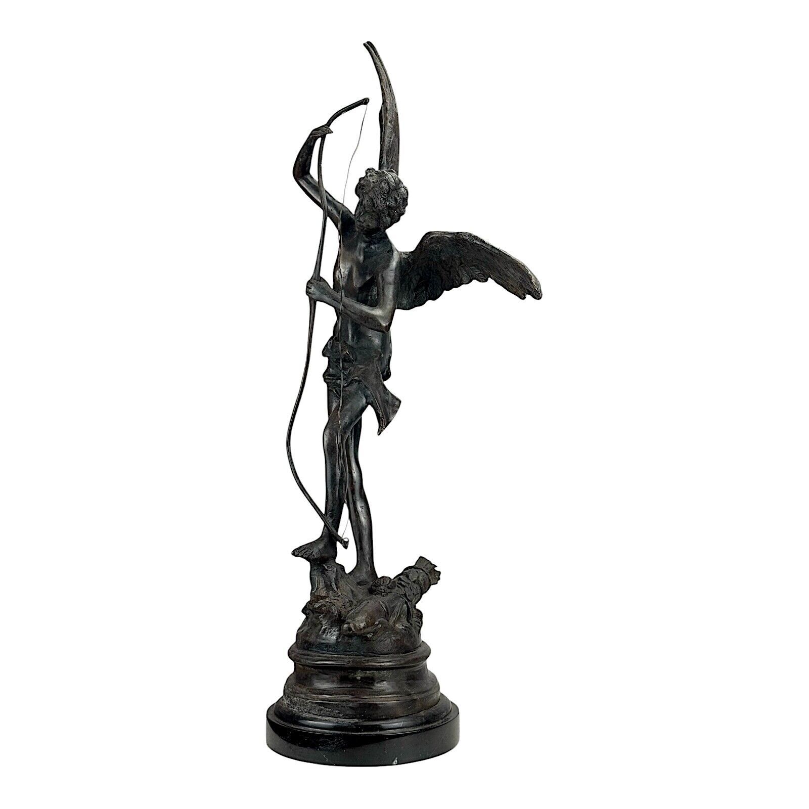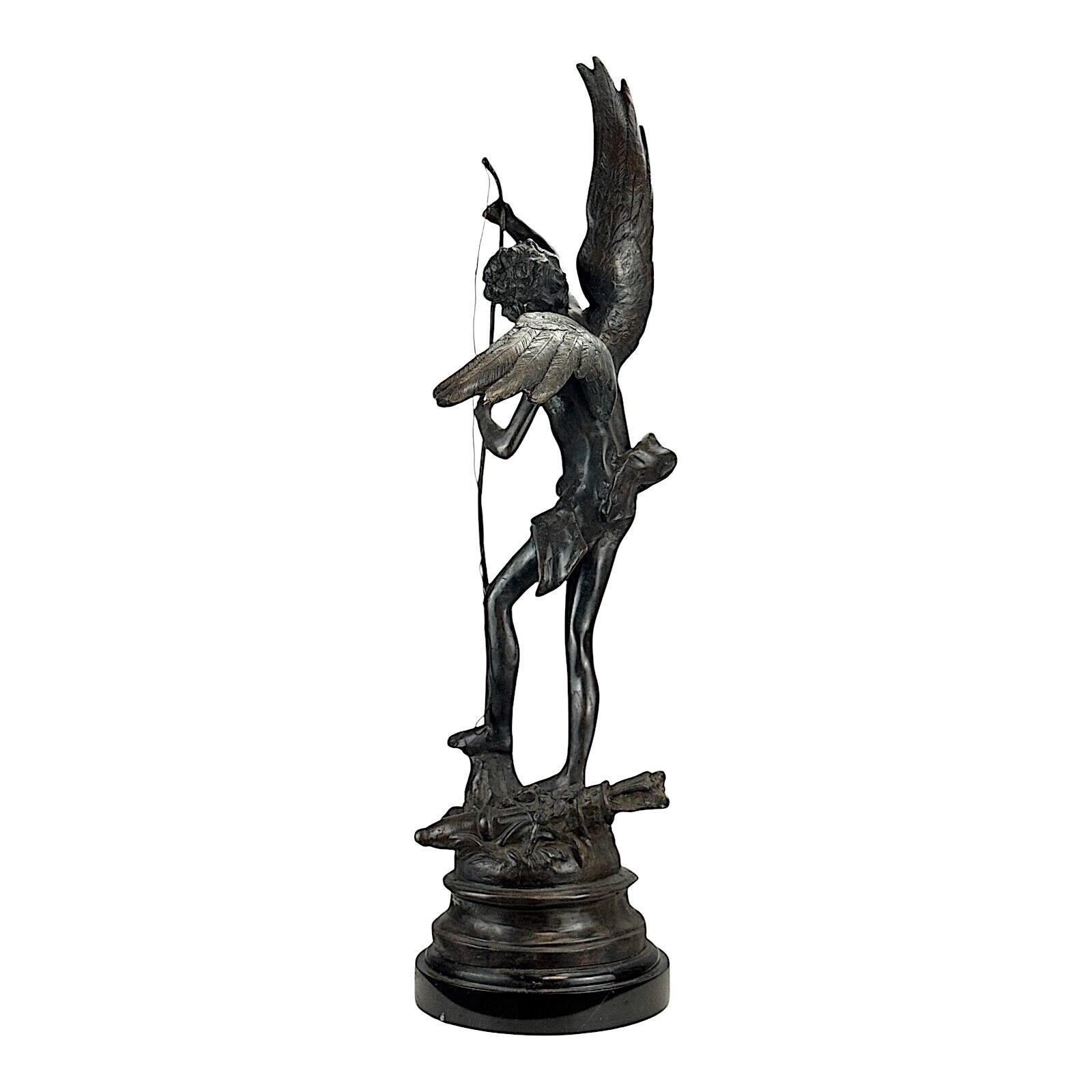 Scultura statua in vero bronzo Cupido che stringe il suo arco su marmo natura...