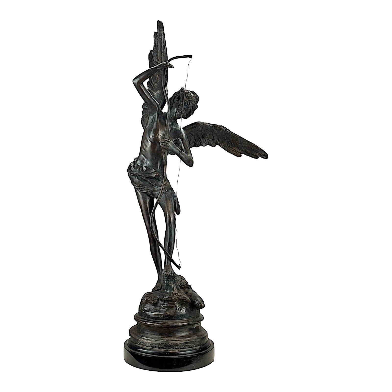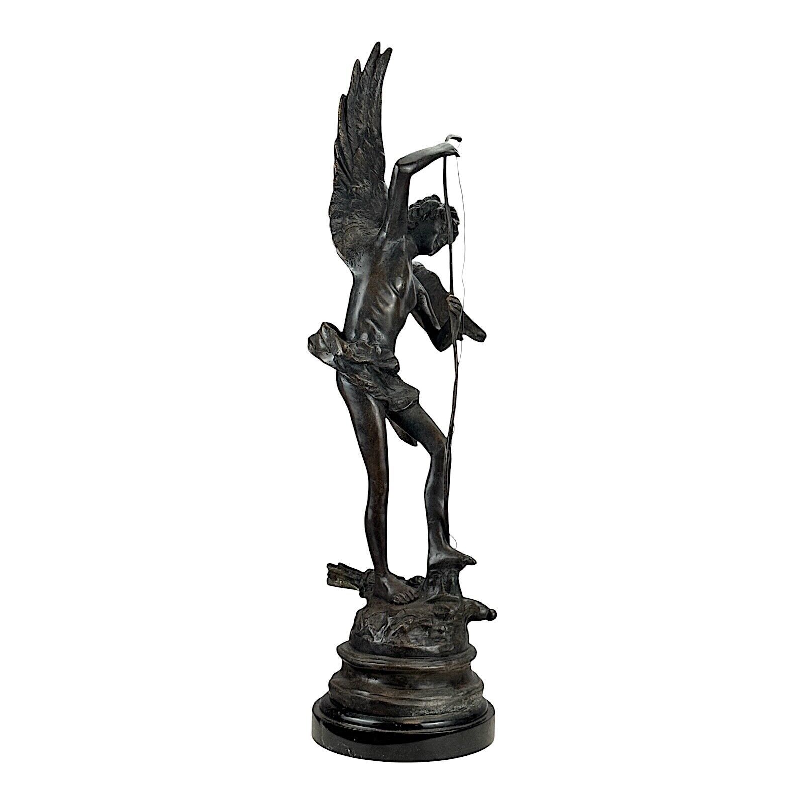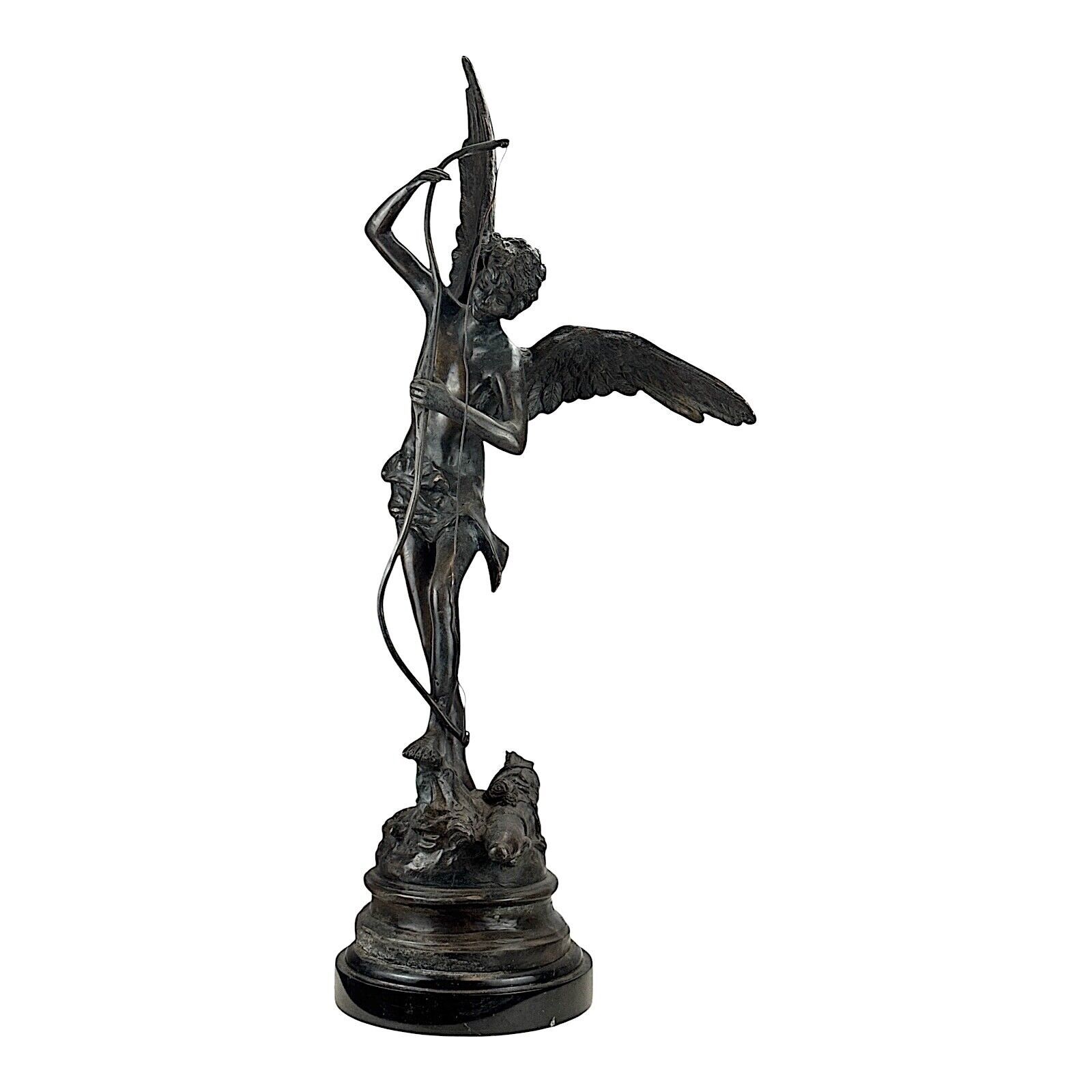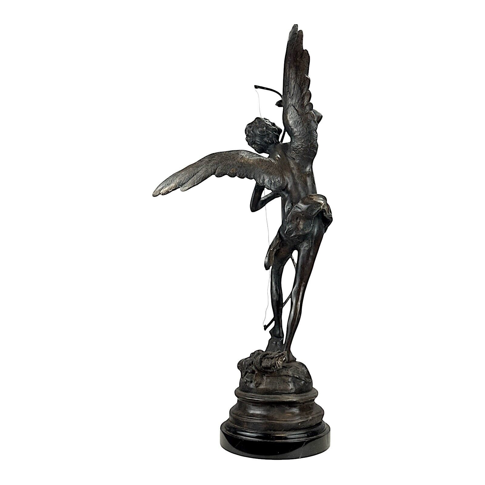 Scultura statua in vero bronzo Cupido che stringe il suo arco su marmo natura...