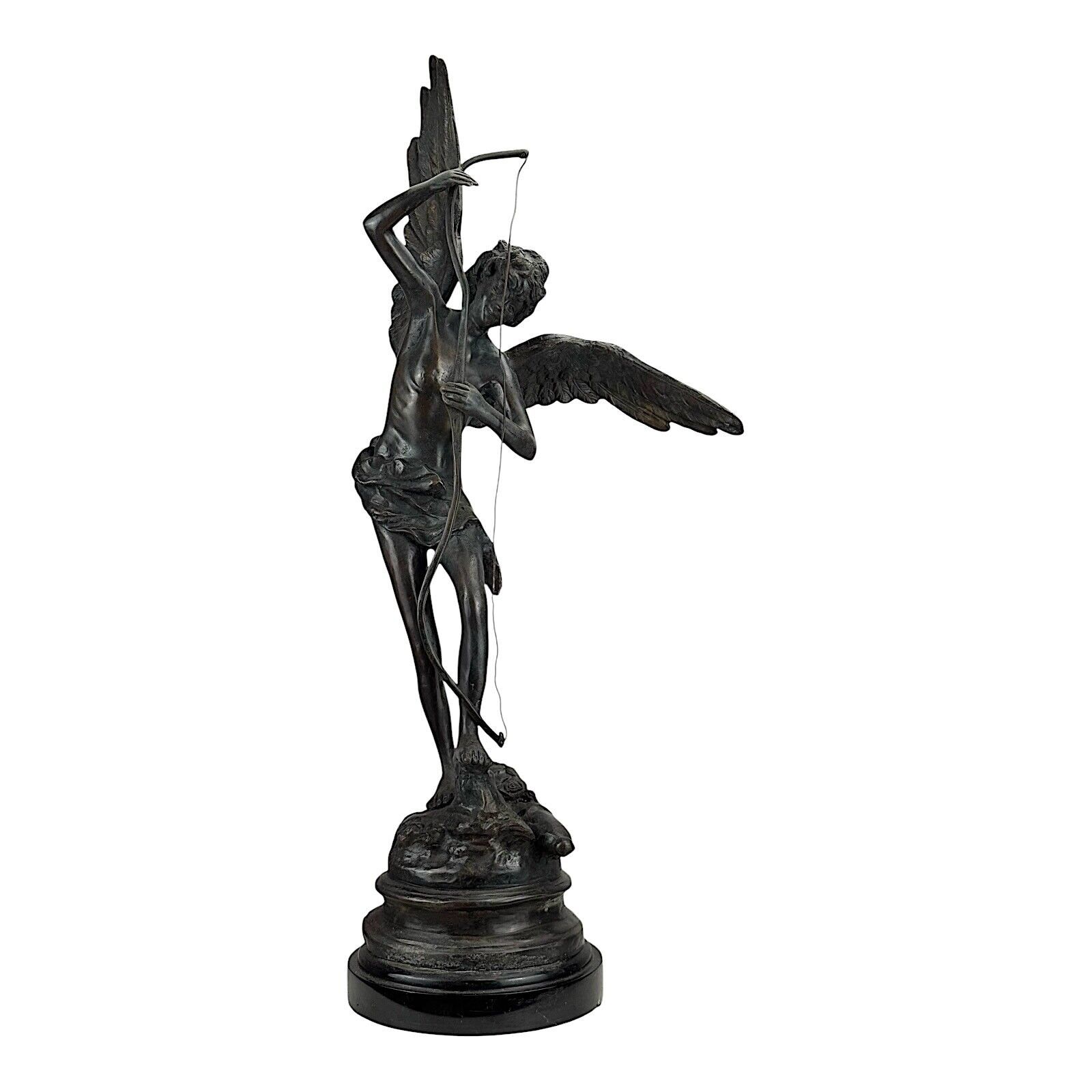 Este impresionante Cupido encordando su estatua de arco esta hecho a mano de bronce real y establecido en un natural base de marmol. Con una altura de 28,35 pulgadas, esta detallada escultura captura la clasica figura mitologica de Cupido en un momento de preparacion, lista para disparar su flecha de amor. El diseño intrincado y la hermosa artesanía lo convierten en un complemento perfecto para cualquier coleccion o una pieza destacada para la decoracion del hogar o la oficina.