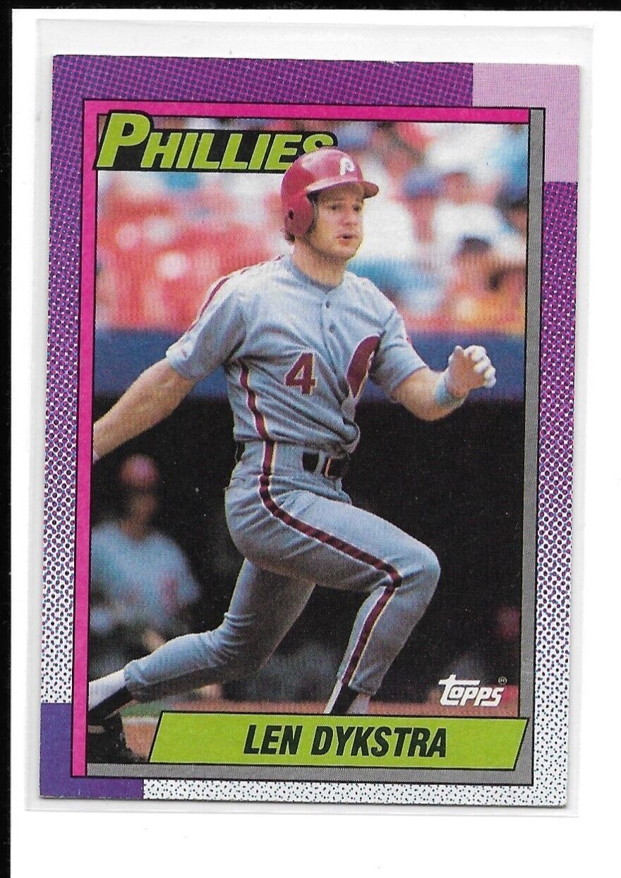 Ships PWE. The product is a 1990 Topps trading card featuring Len Dykstra of the Philadelphia Phillies. This vintage sports trading card is made of card stock, original, and part of the MLB league. It showcases Dykstra in his Phillies uniform and is a standard card size, making it a desirable collectible for baseball fans and card enthusiasts. The card is in English and was manufactured by Topps in the United States. It is a great addition to any baseball card collection, especially for fans of the Philadelphia Phillies or Len Dykstra.