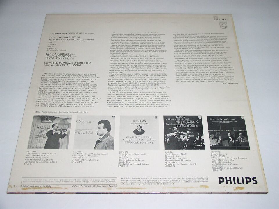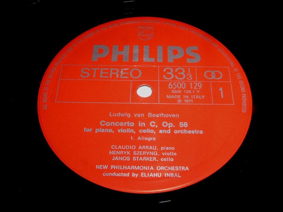 This is a vintage, Italy import phonograph record album entitled, "beethoven Triple Concerto". Claudio Arrau, Henryk Szeryng, Janos Starker, Eliahu Inbal New Philharmonia Orchestra. Record label: Philips 6500 129 (Stereo).