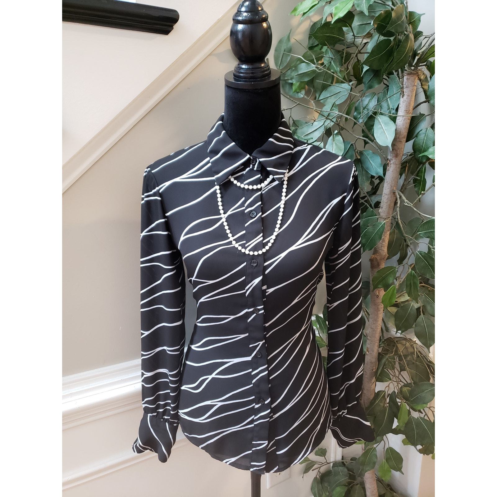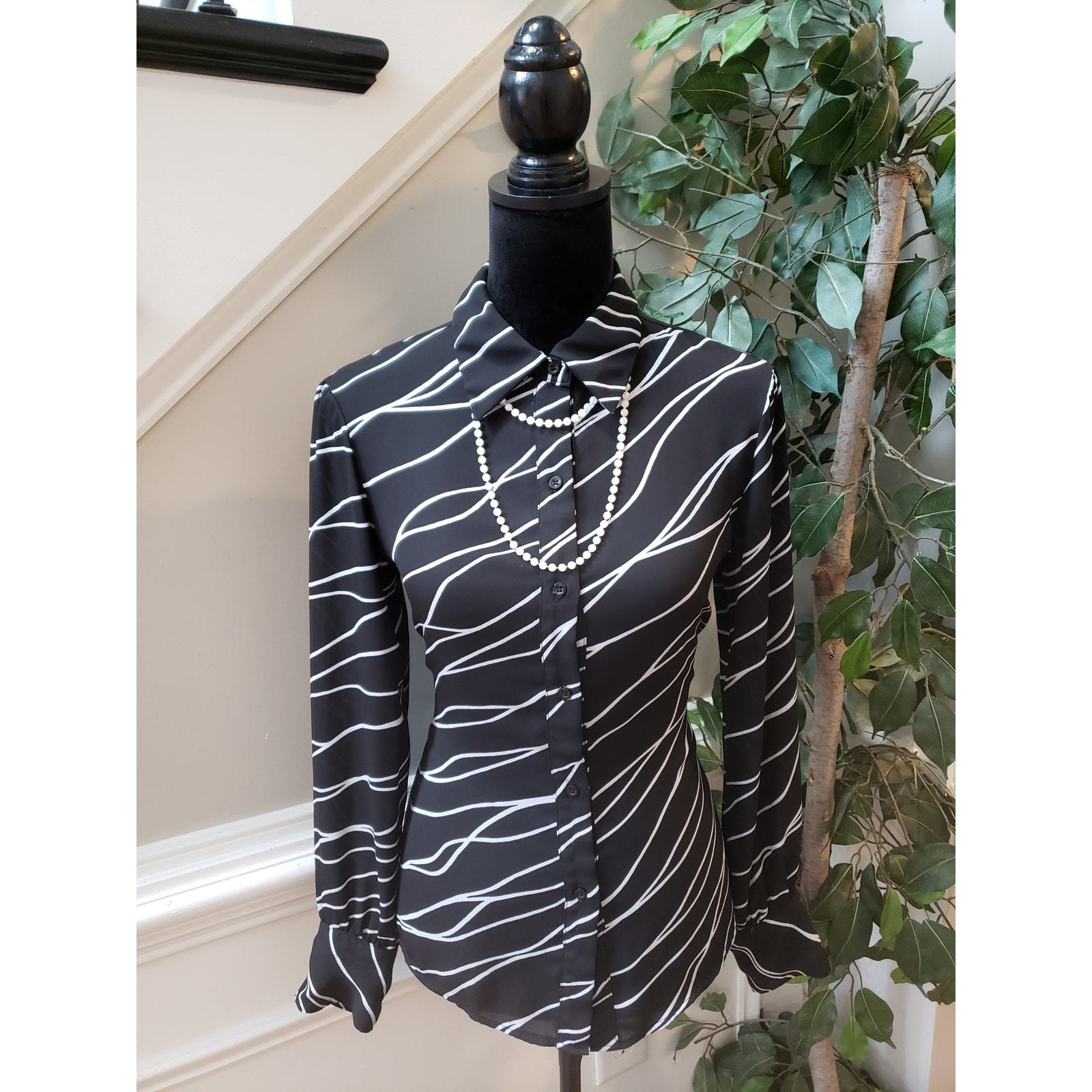 Bar III Botton Down Shirt Women's Size Small White Black Printed Long Sleeve