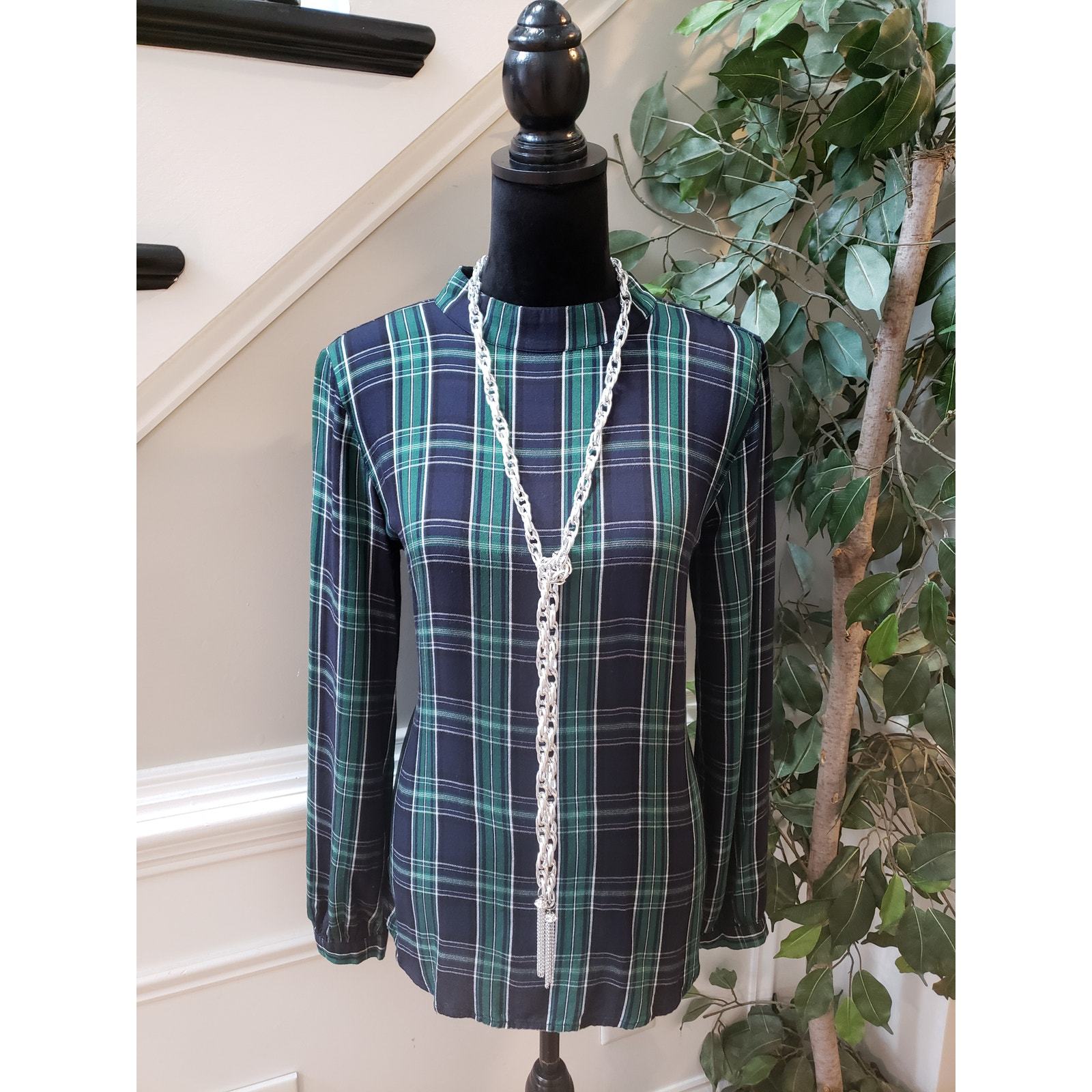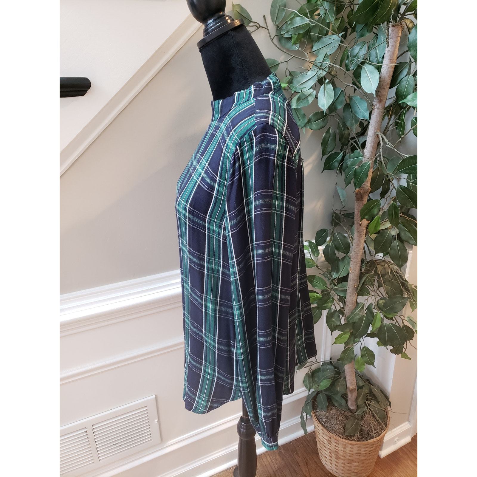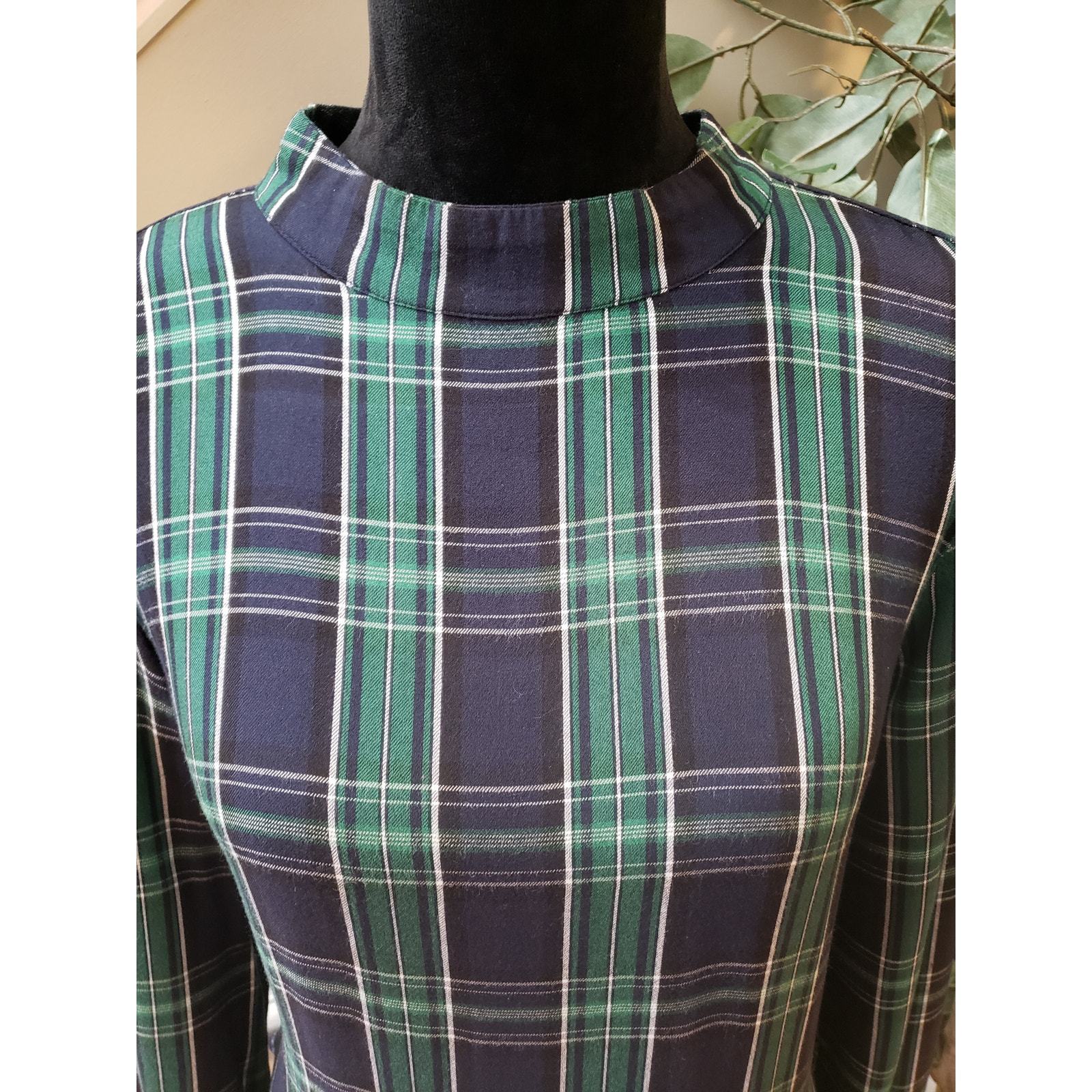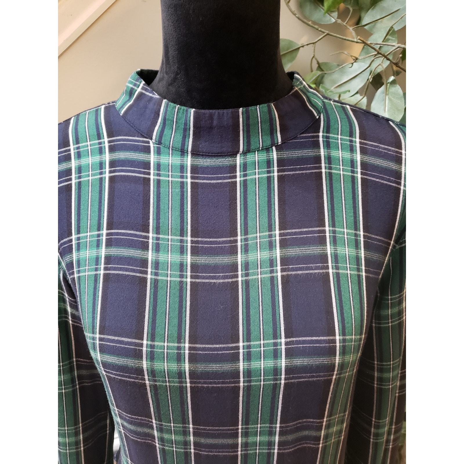 LOFT Blouse Top Women Size Small Multi Plaid Rayon Flannel Long Sleeve Mock Neck