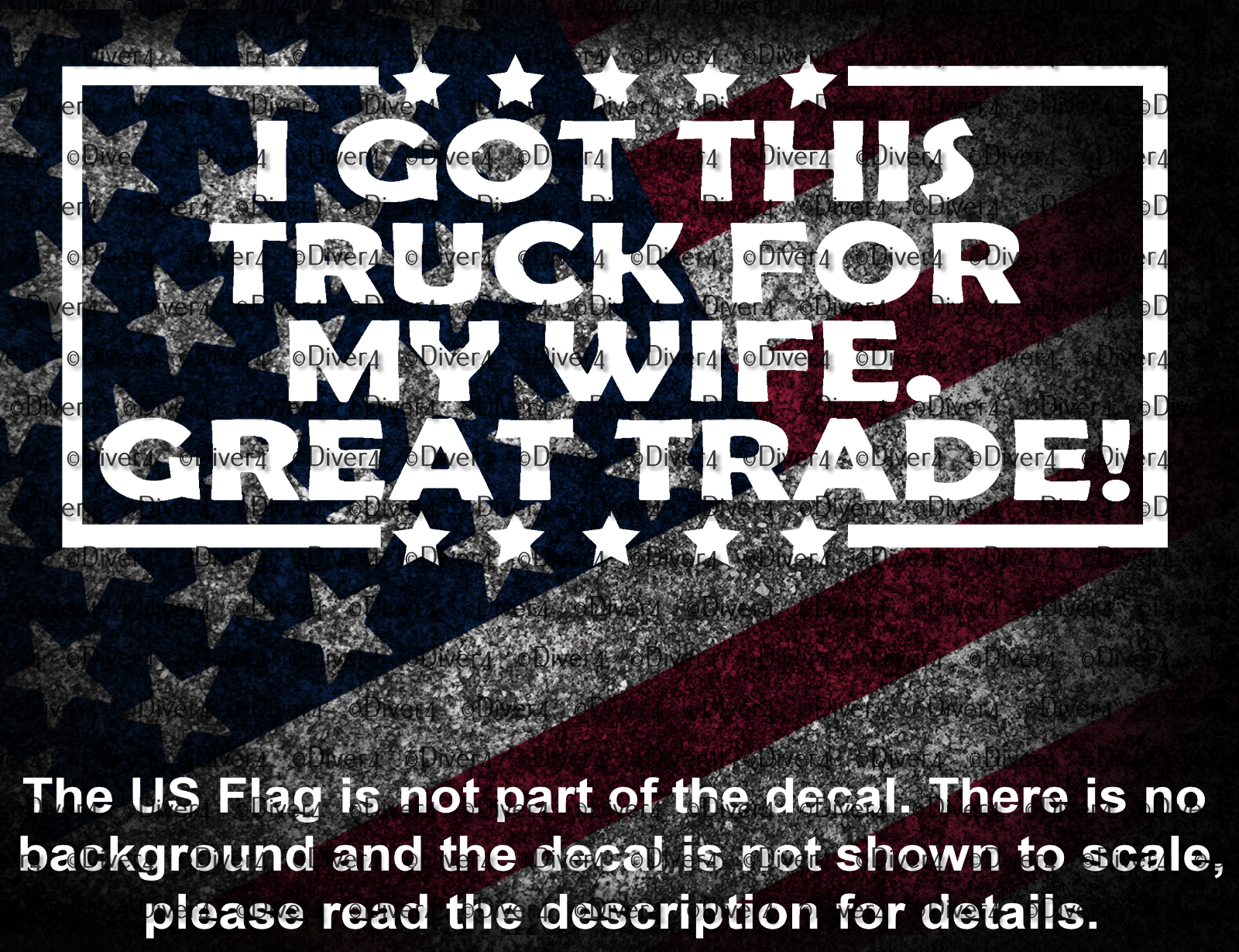 This is a custom I Got This Truck For My Wife. Awesome Trade! vinyl car/truck window decal bumper sticker.