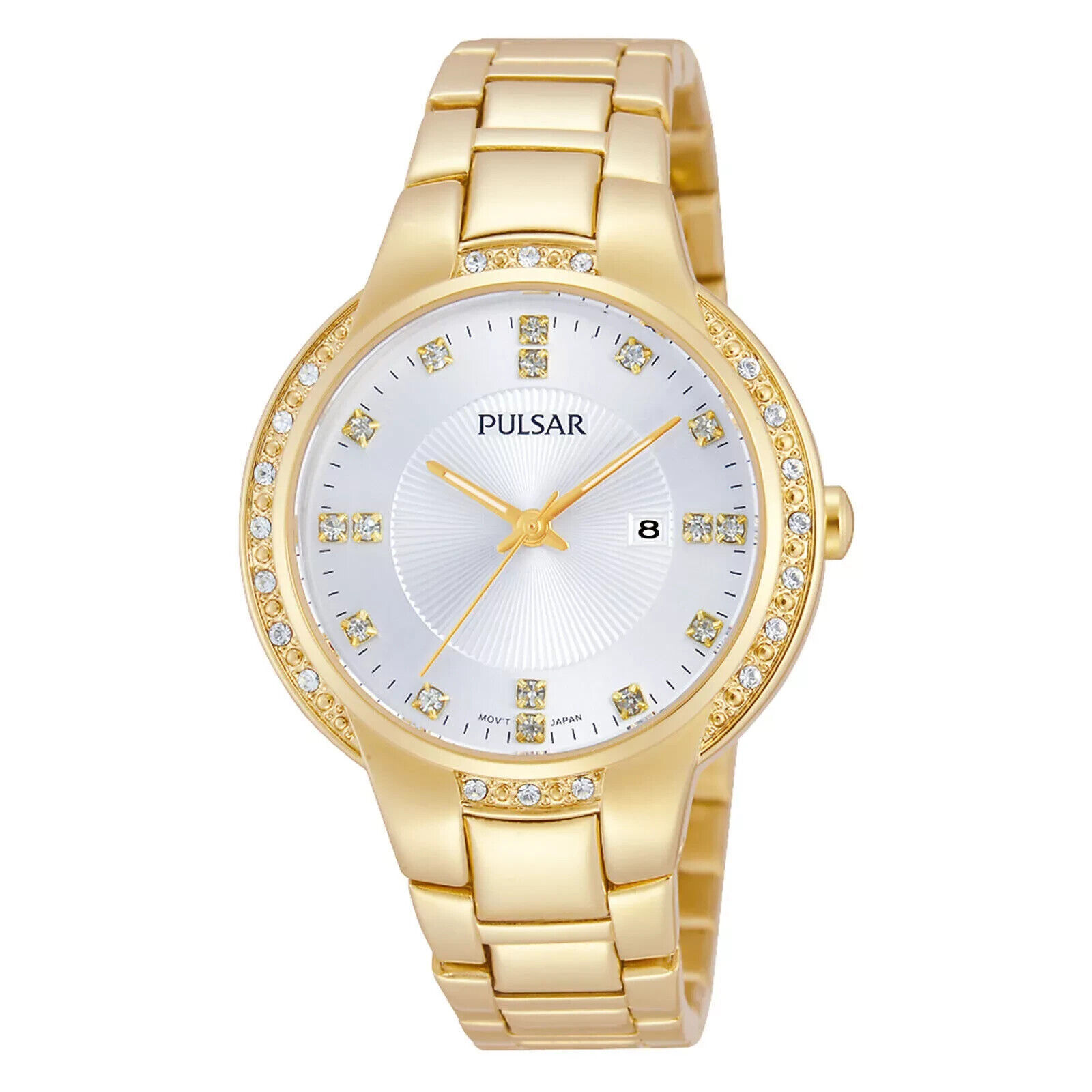 This Pulsar Women's PJ2014 watch features a luxurious design with a round silver dial and a gold stainless steel case and bezel. The gold stainless steel band complements the overall elegant look, making it suitable for dressy occasions. The watch is powered by a reliable quartz movement and offers water resistance for added durability. With its sophisticated style and quality construction, this Pulsar watch is a stylish accessory for women who appreciate both fashion and functionality.