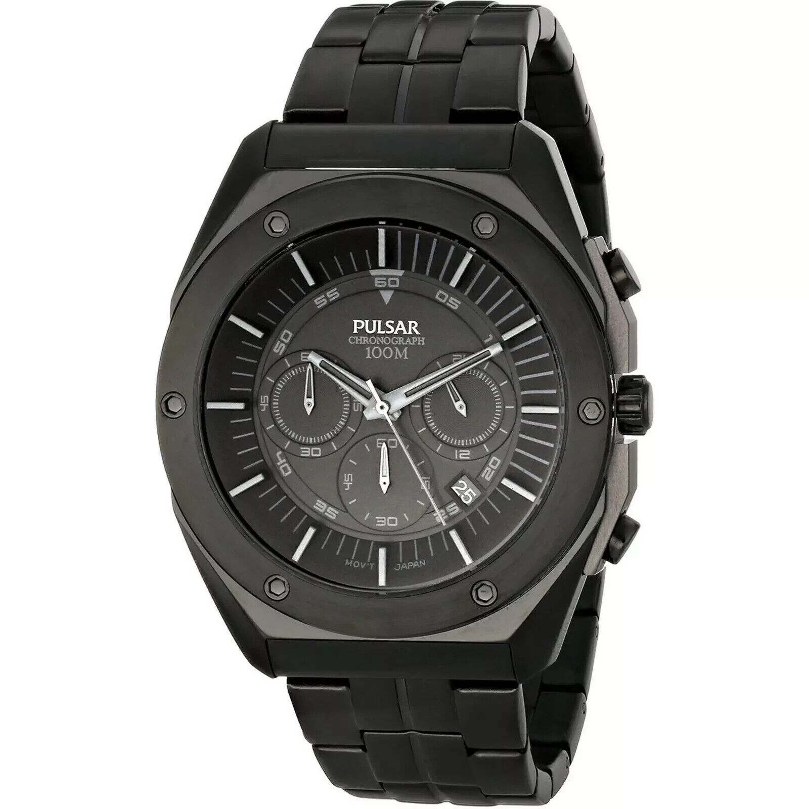 The Pulsar Men's PT3521 Watch is a stylish and versatile timepiece suitable for various occasions. Featuring a black stainless steel bracelet and case, this watch has a round black dial with Arabic numerals and a chronograph function. The Japanese quartz movement ensures accurate timekeeping, while the water resistance of up to 100 meters adds durability and functionality. With its sporty yet classic design, this Pulsar watch is a modern and fashionable choice for men on the go.