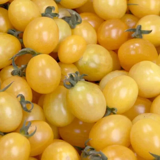 Indeterminate - This champagne colored mini cherry tomato is one of the sweetest on the market! Its abundant yields and vigorous growing habits will require trellising. Disease resistant and heat tolerant.