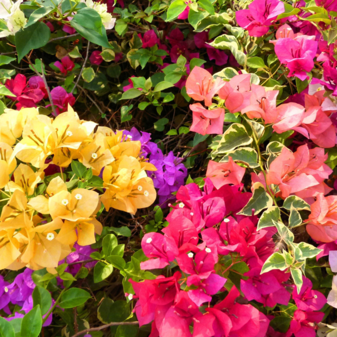 - Thorny, evergreen vine with bright, mix-color blooms in shades of pink, purple, orange, and white