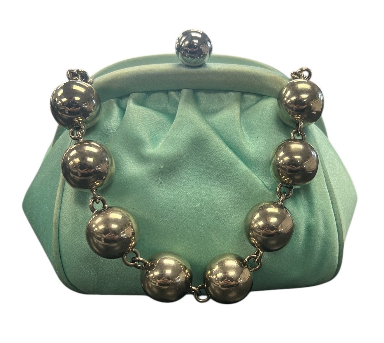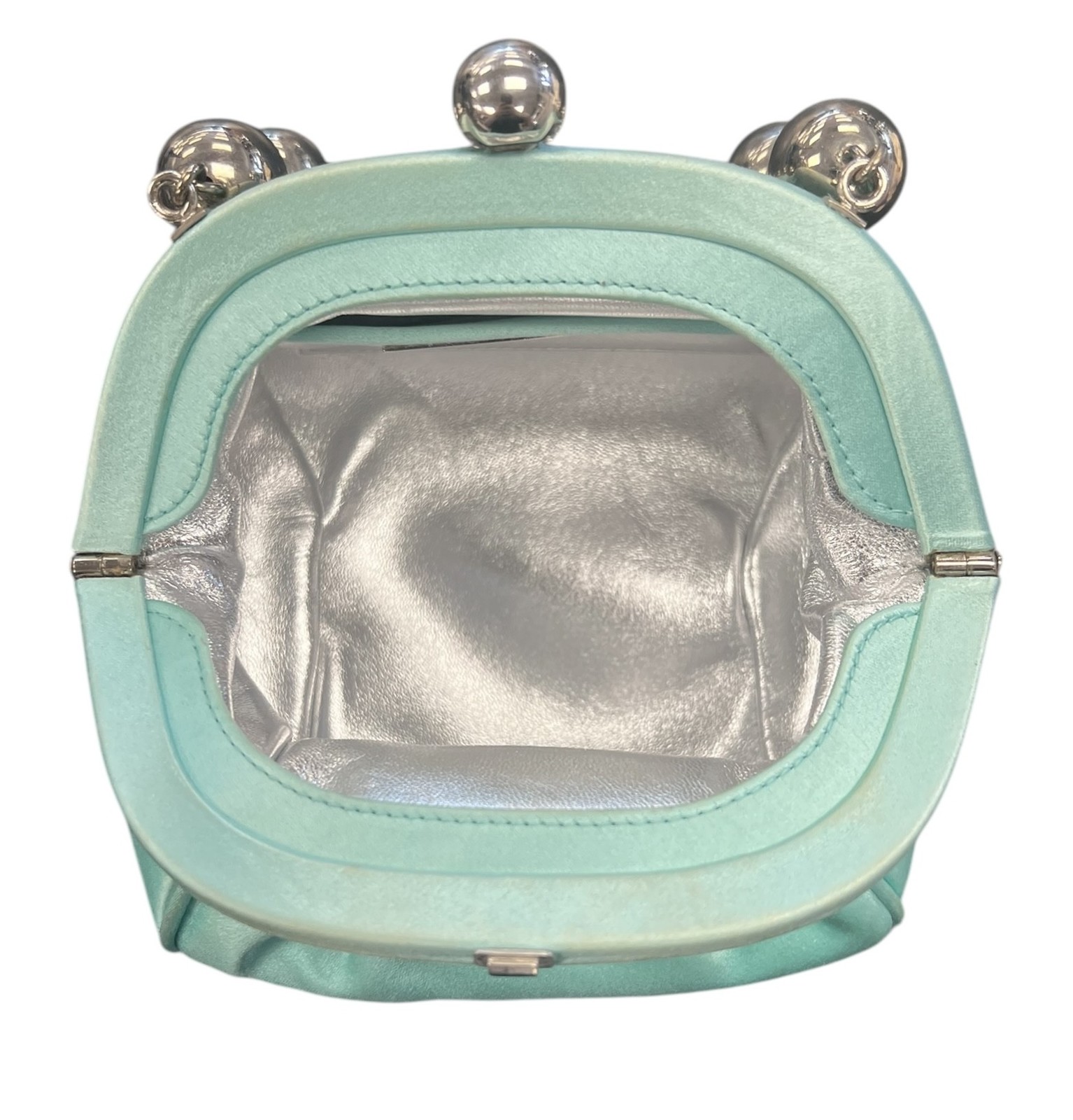 Type: PurseBrand: Tifany CoModel name: Silver Ball Bracelet HandbagColor: Holly BlueSize: SmallMaterial: SatinBox included: noCondition:UsedNotes:Vintage bag. Not in perfect condition. One pen mark on the exterior.