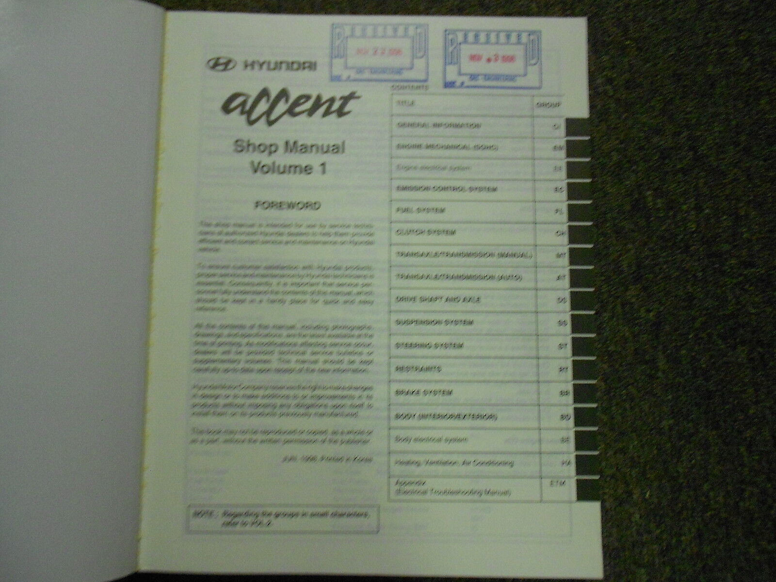 Loads of information and illustrations, covers a lot, no missing pages, step by step Instructions, exploded illustrations and/or diagrams, great manual to have when you own a HYUNDAI Accent and it will keep your vehicle on the road. This manual will save you money in Repairs/Service.