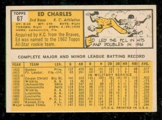 1963 Topps Baseball Card Ed Charles Kansas City Athletics #67 3rd Base