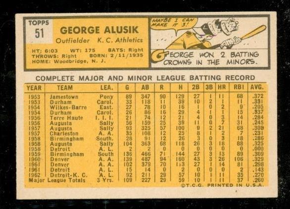 1963 Topps Baseball Card George Alusik Kansas City Athletics #51 Outfield