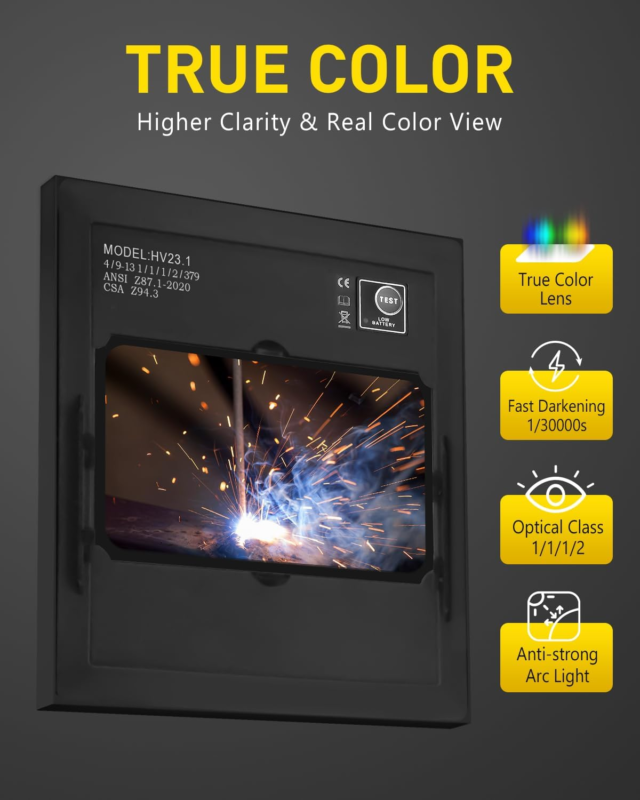 Amazingly Large Viewing: With a 3.94"x2.36" supersize viewing that far exceeds of other brands welding helmets. Features 1/1/1/2 optical clarity lens with advanced true-color technology, it restore every details of working conditions, improve visibility and reduce your eye strain