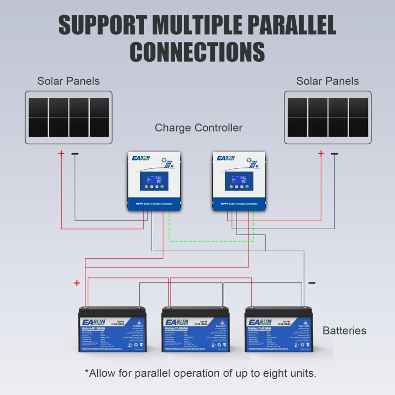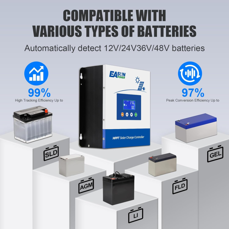 Wide Battery Compatibility:Compatible for PV systems in 12V, 24V, 36V and 48V, maximum charging current up to 60A; Support a wide range of lead-acid batteries including flooded, AGM, GEL, Lithium-ion batteries