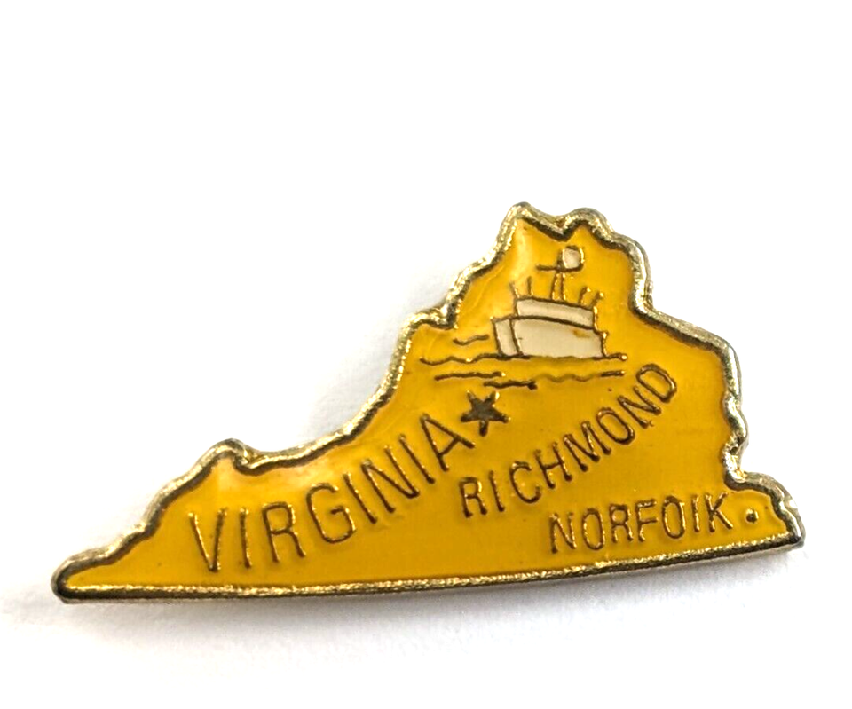 Virginia State Map Richmond Norfolk Riverboat Yellow Gold Tone Enamel Pin VTG