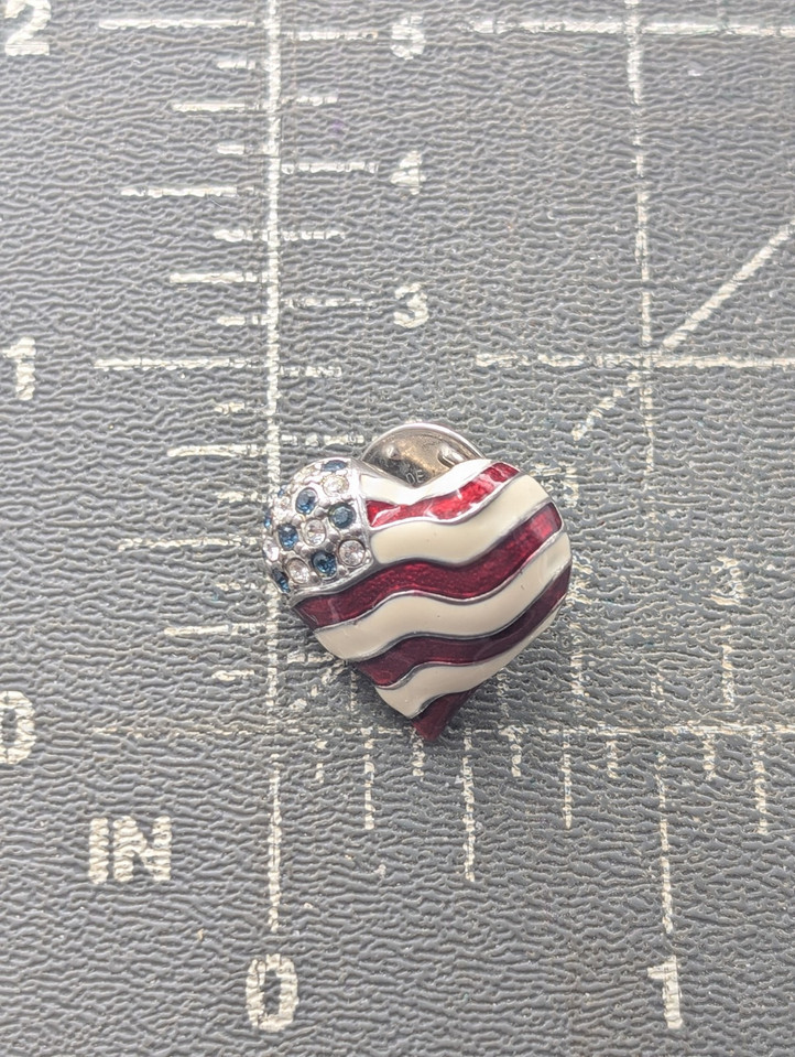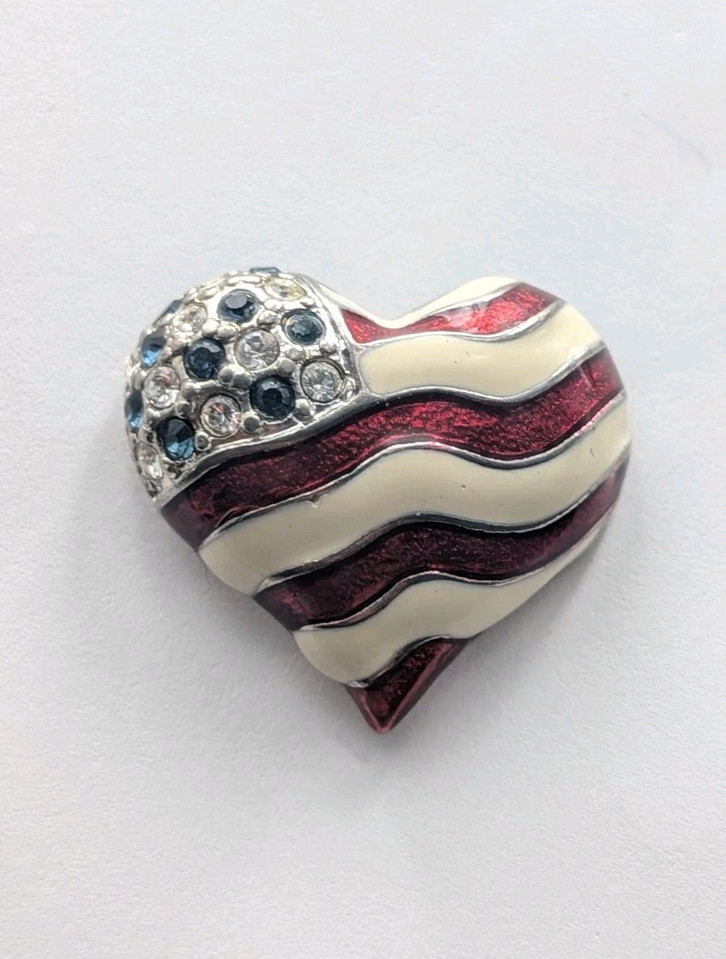 VTG LC Liz Claiborne Patriotic Heart Blue Clear Rhinestones Red White Enamel Pin