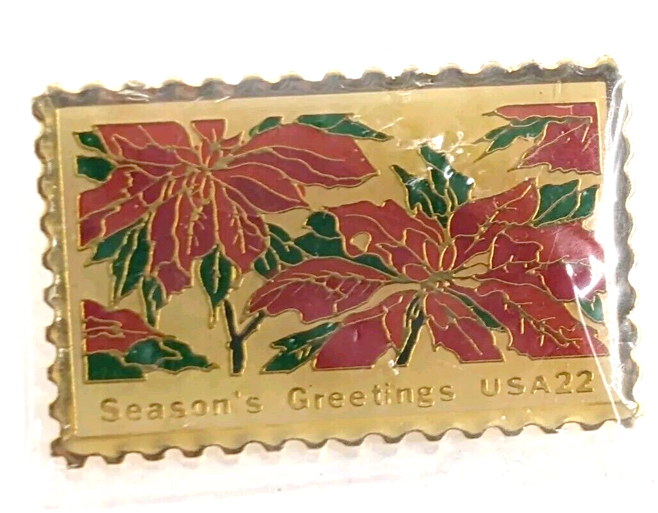 VTG Christmas Poinsettia Season's Greeting Red Flowers USPS 22c Stamp Pin Wemmco