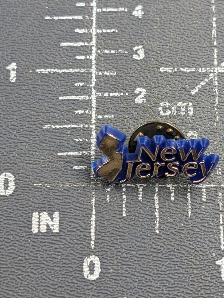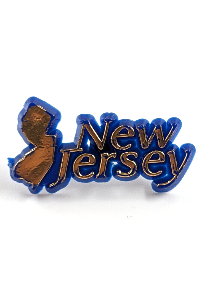 VTG Jew Jersey NJ State Map Text Gold Blue Plastic Lapel Pin Souvenir