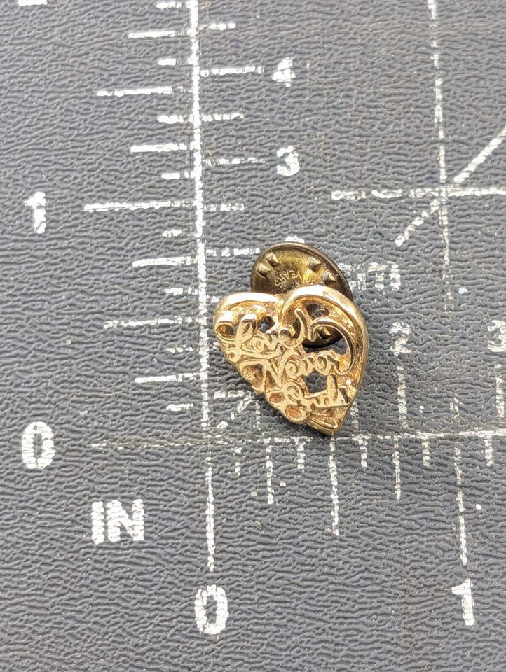 VTG Love Never Ends Gold Tone Open Heart Design Letters Pin Religious Romance