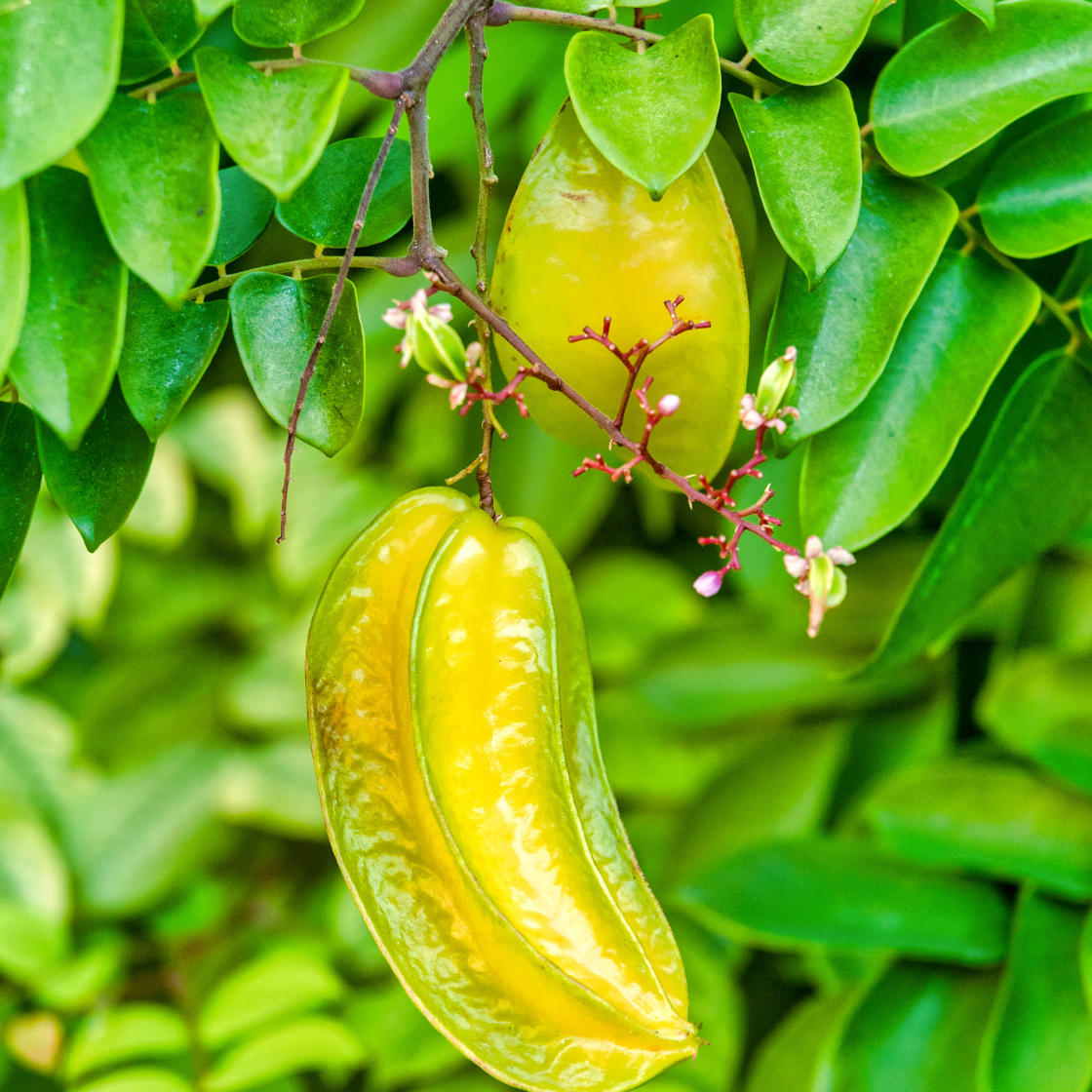 - Tropical and subtropical, evergreen tree with a mature height of up to 20-30 feet, featuring stunning, star-shaped fruits and vibrant green leaves