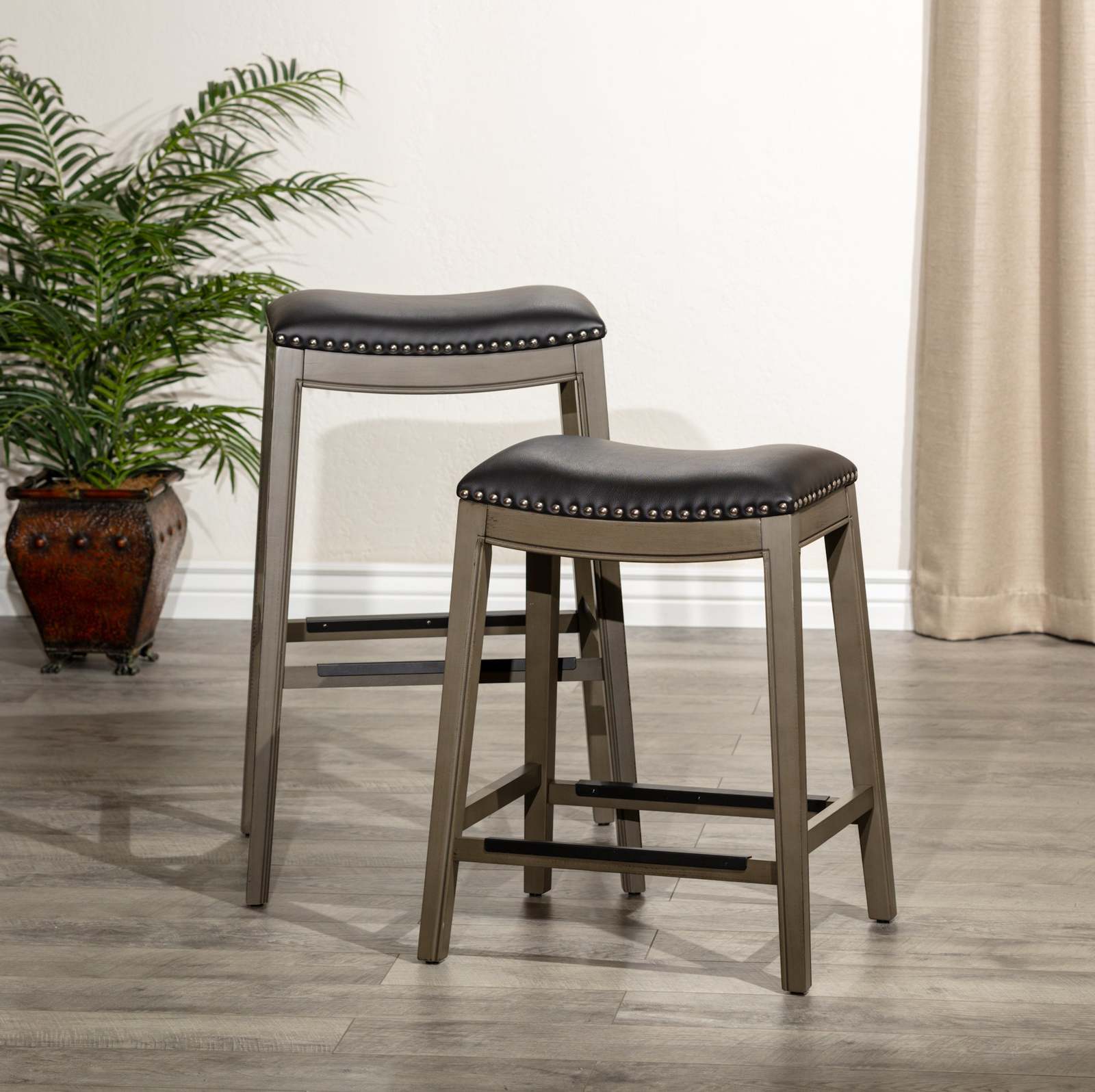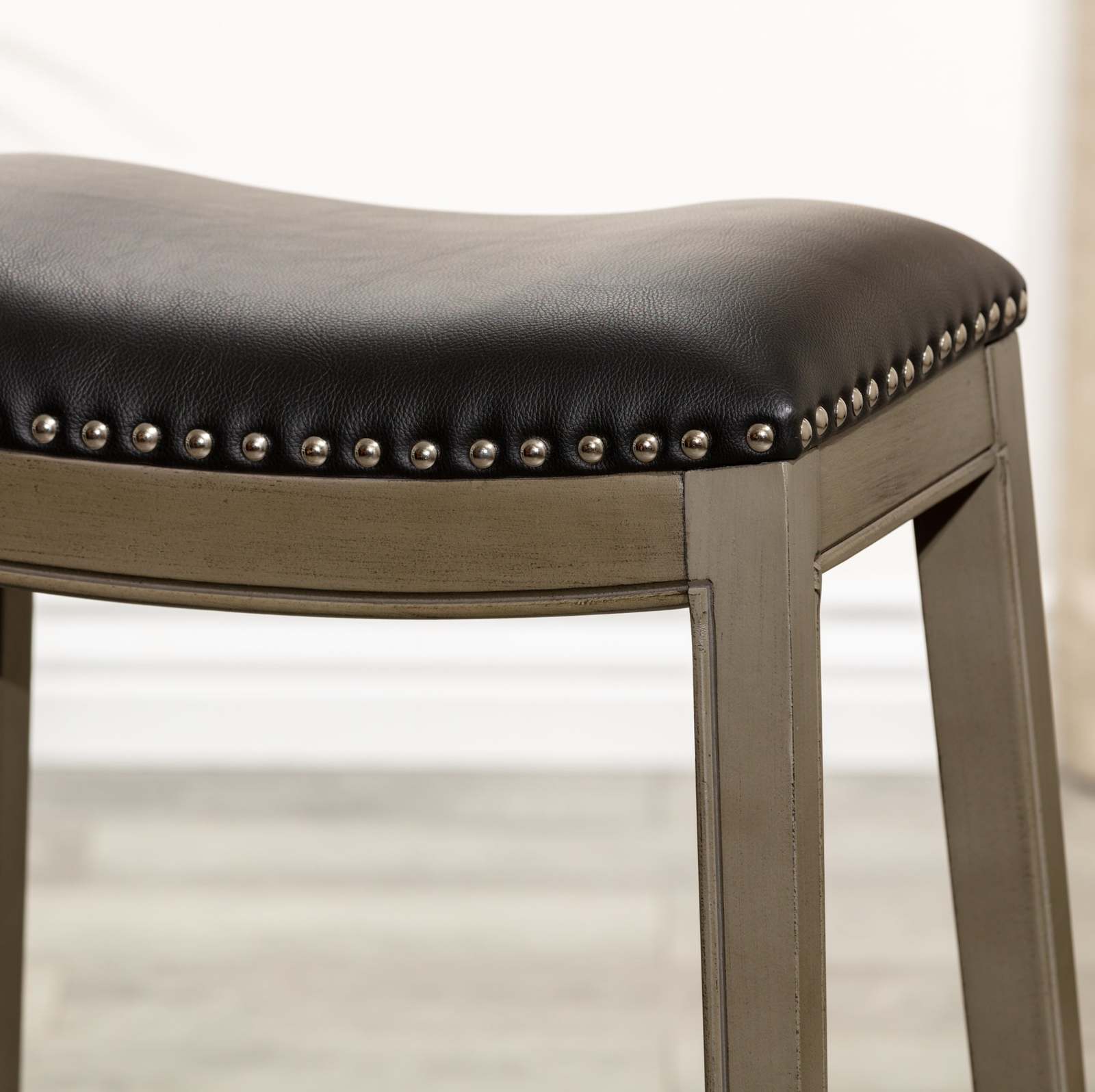 The subtly contoured seat and timeless design make this stool an enjoyable spot to linger. These stools are built to last with a solid hardwood frame, metal foot plates to protect the stool from footwear damage and a bonded leather seat. This stool is available in two sizes and five finishes. The padded saddle seat is upholstered in bonded leather with complementing nail head trim. The simple yet elegant design and color palette make it easy complement any kitchen or dining decor.