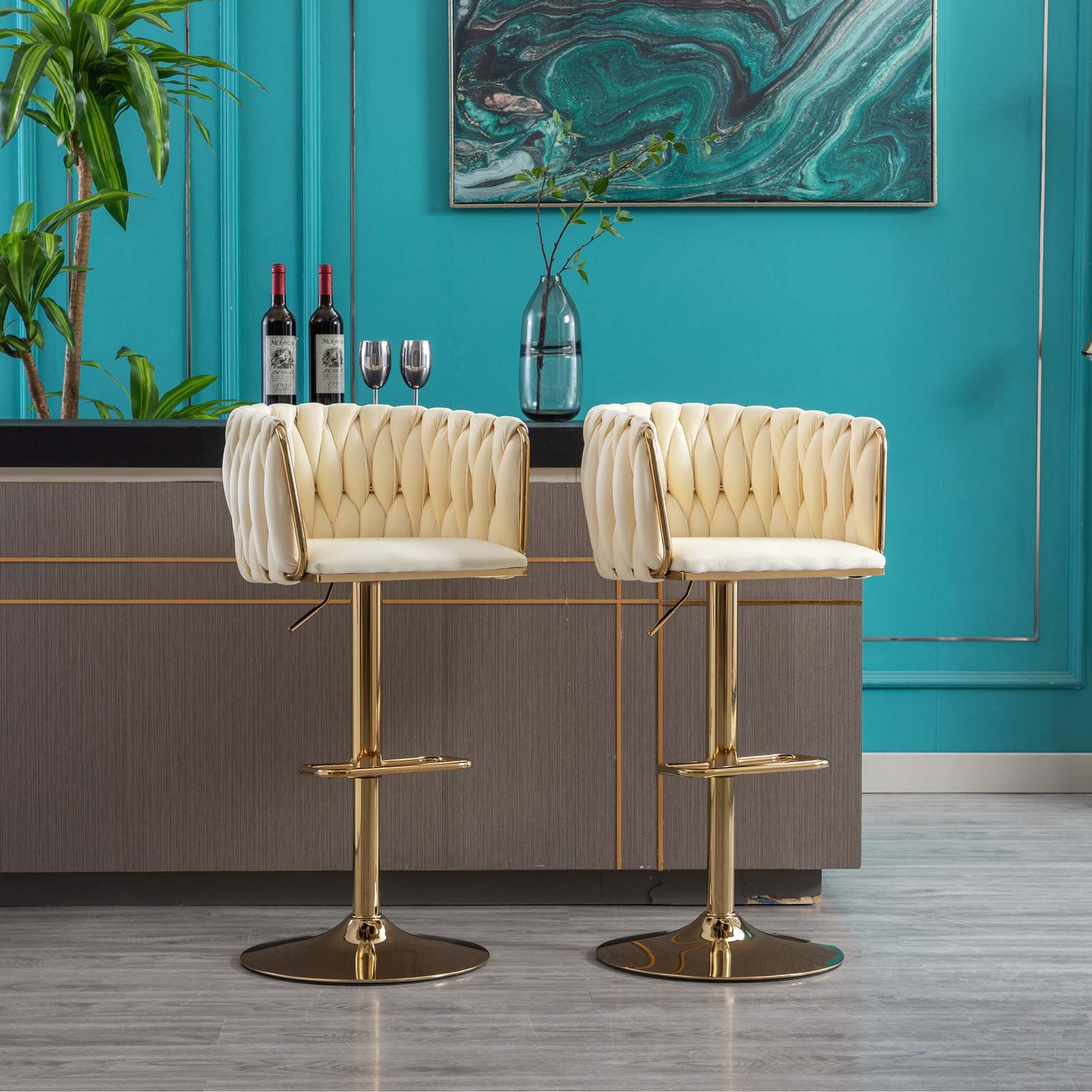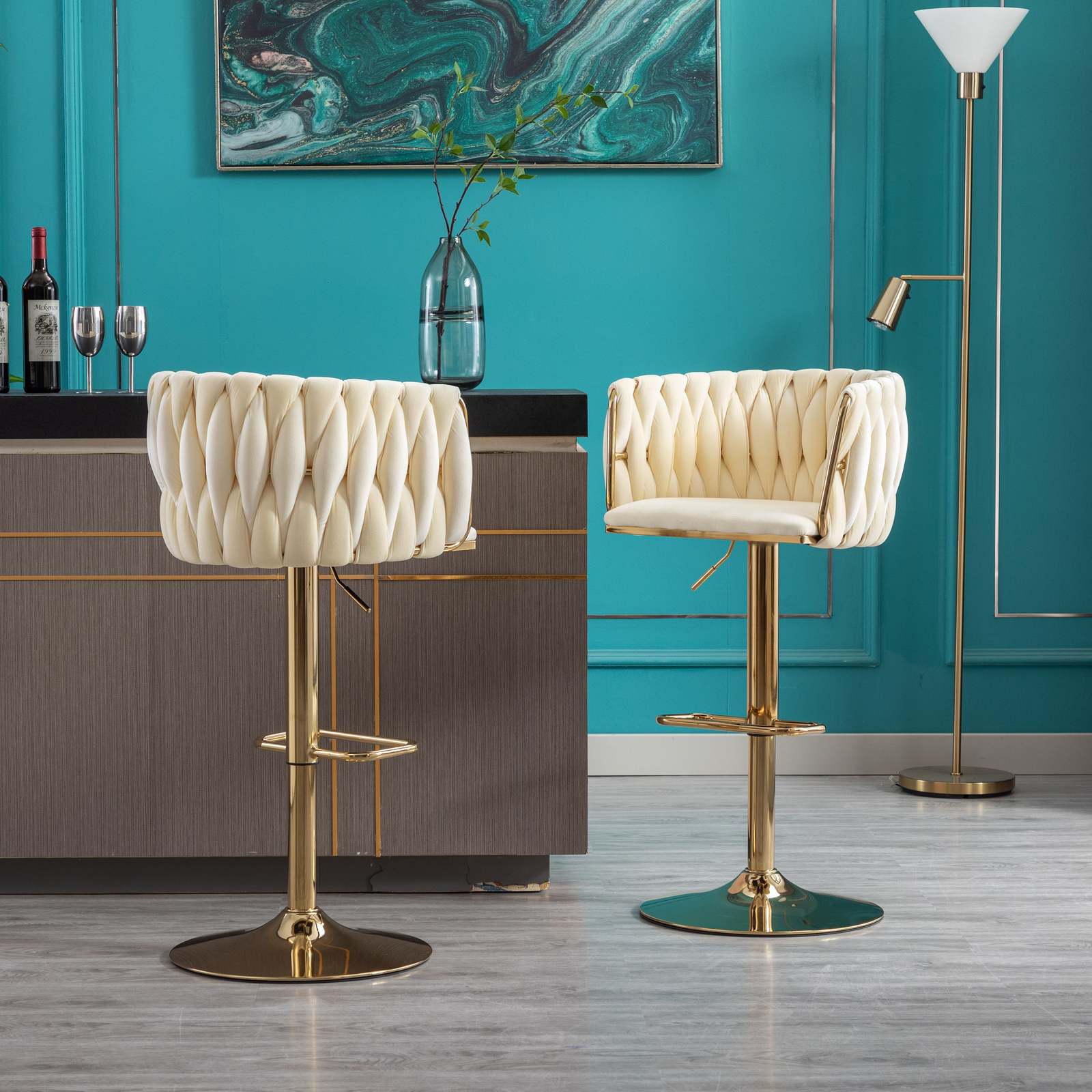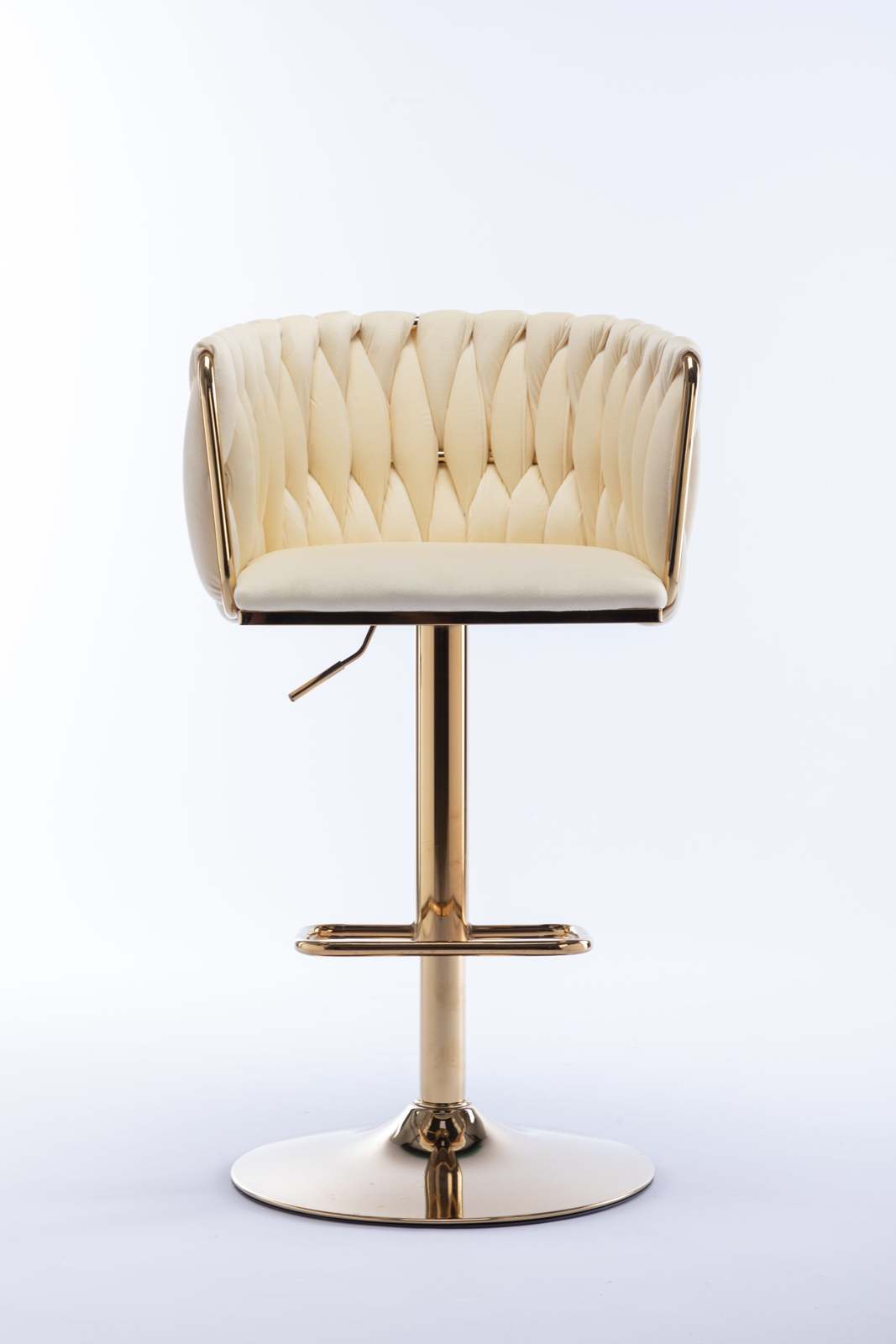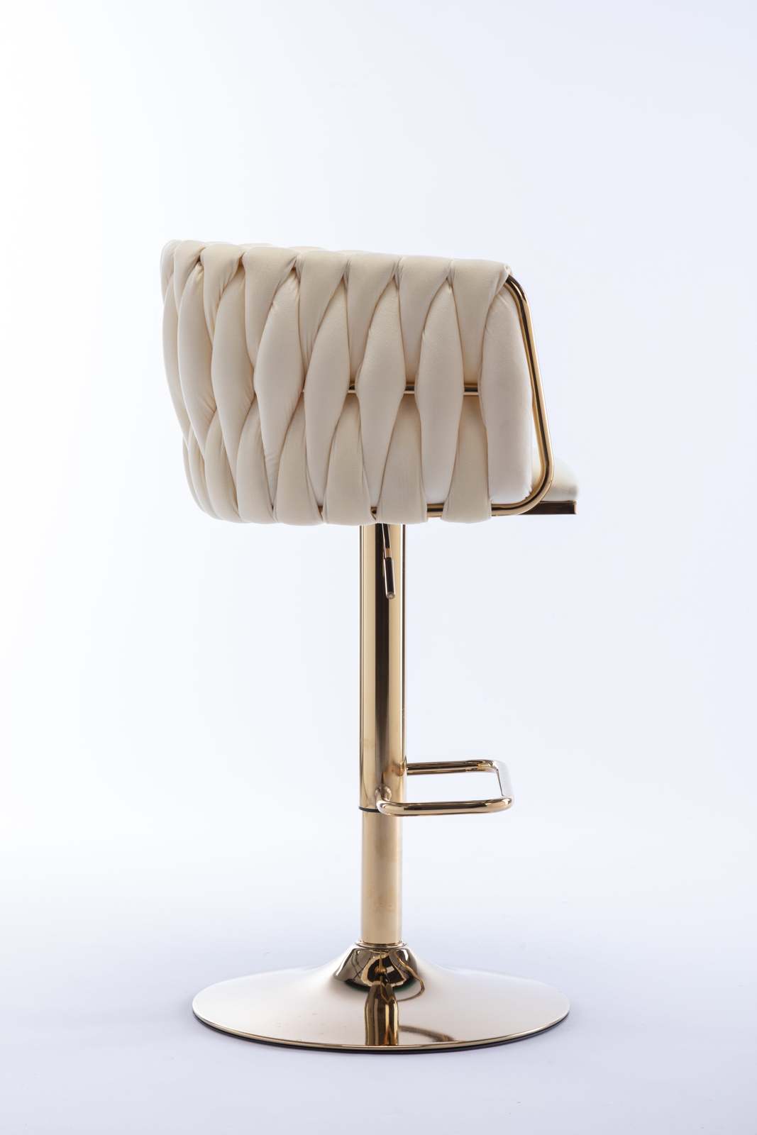 bar stool is made of gold metal and velvet fabric, woven to create a very eye-catching design. Perfect for restaurants, kitchens, cafes, offices, bars, exhibitions, or any other decor theme, it fits your space and your home more seamlessly so you can create a fun and original atmosphere.