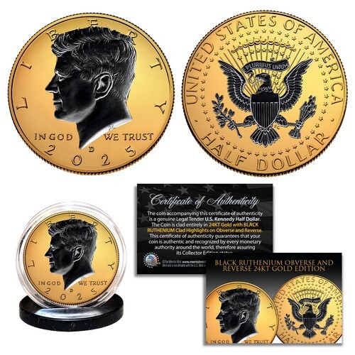 Here is your chance to own the BLACK RUTHENIUM EDITION 2021 JFK Kennedy Half Dollar U.S. Coin. To highlight the original coin design, the Merrick Mint has clad the coin in entirety in Black Ruthenium with the JFK Portrait on the coin obverse and reverse, clad in 24KT Gold. These uncirculated legal tender U.S. coins are not in general circulation and are not available in any bank. Each coin features the portrait in 24K Gold plating of John F. Kennedy design on the obverse and a presidential seal design on the reverse in 24K Gold Plating. Each coin comes in an acrylic coin holder and includes a Full Color 2-sided Certificate of Authenticity. The 2021 Kennedy half dollar is a U.S. fifty cent coin with P mint mark.
