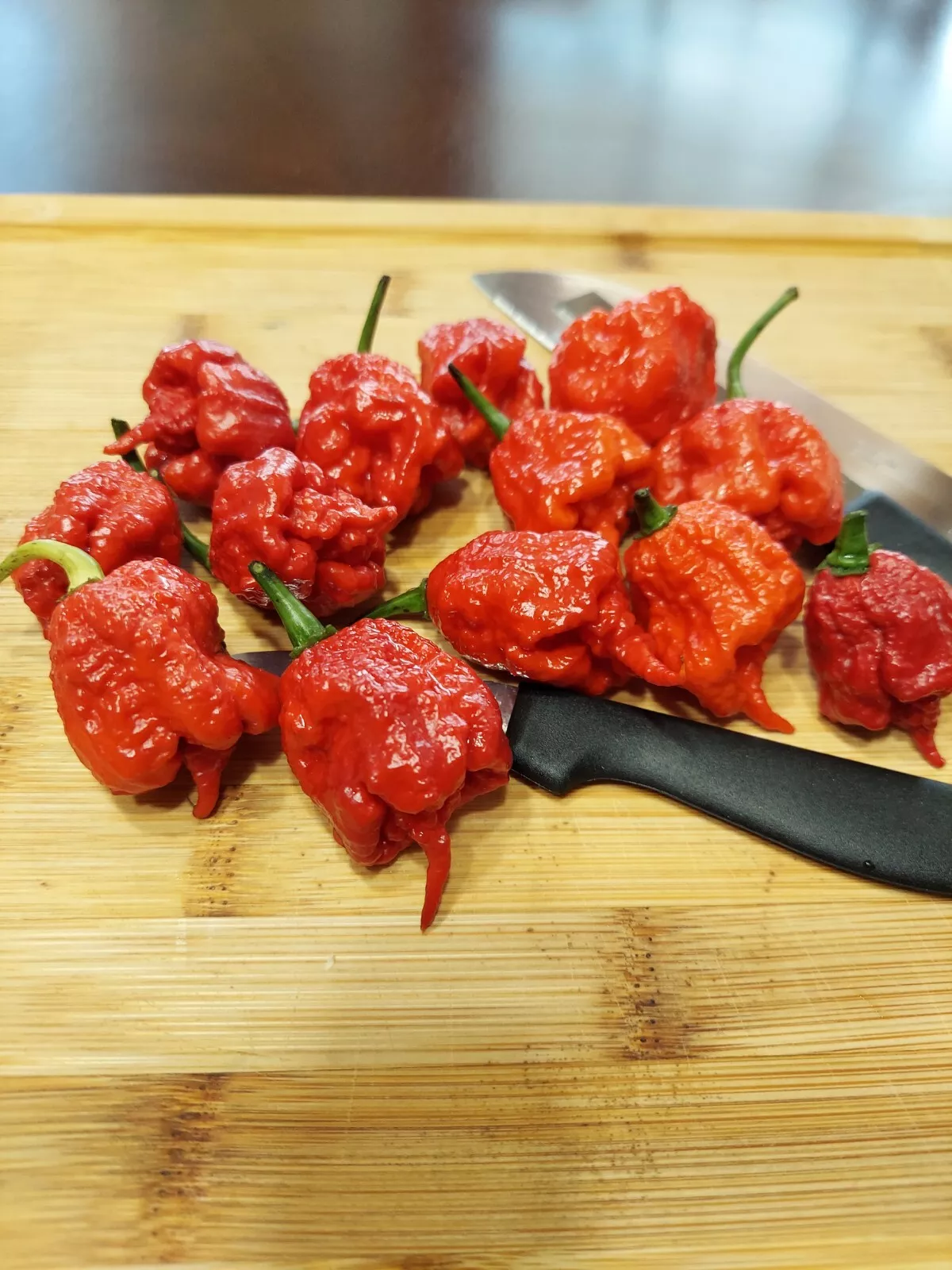 This listing is for 25 Carolina Reaper pepper seeds hand selected from only ripe peppers. Our seeds are open pollinated, hand harvested, grown with only the highest quality organics in America. These Carolina Reapers were grown in my back yard during the 2023 season.