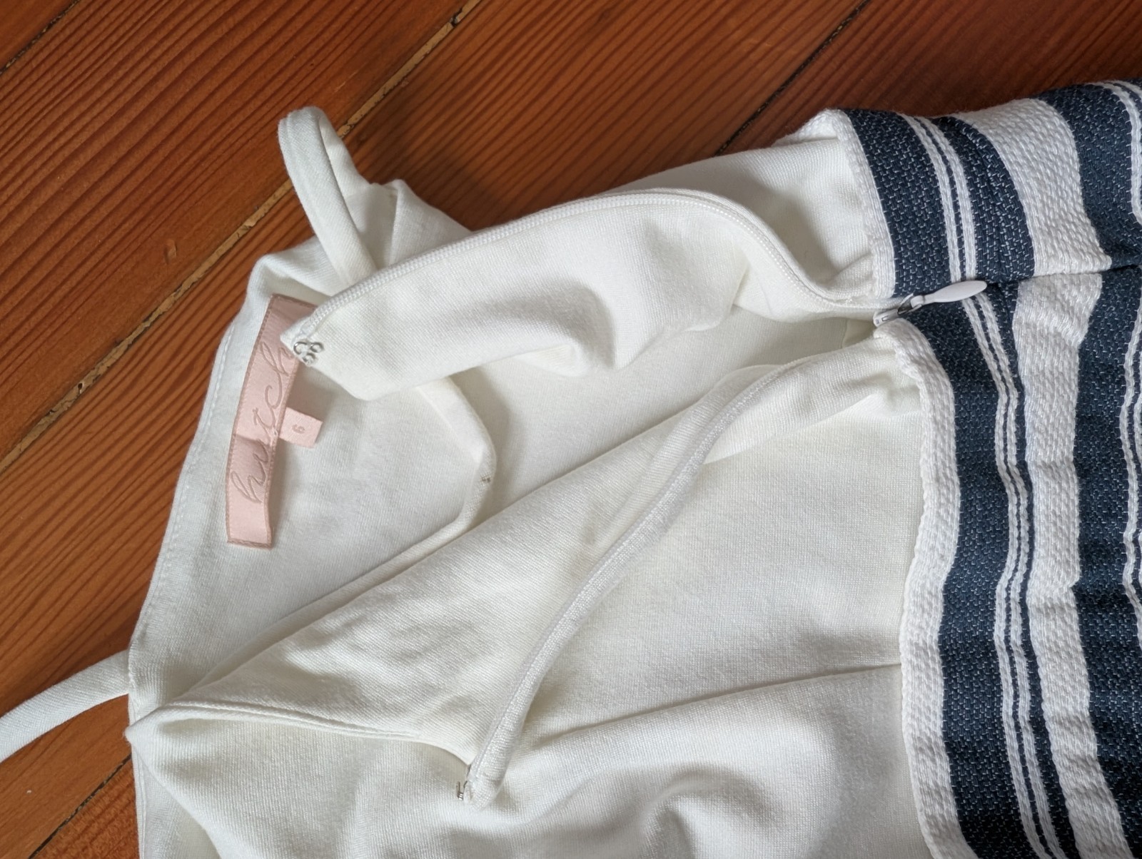 Thick stretch ivory V-neck spaghetti strap top with Blue and white striped woven textured skirt that is lined