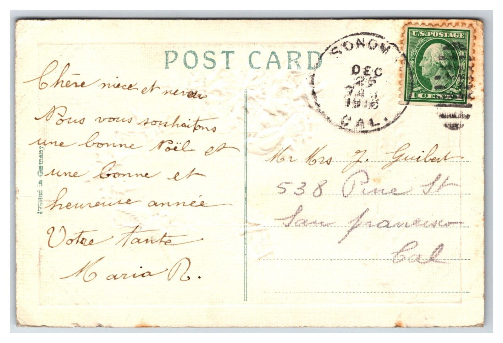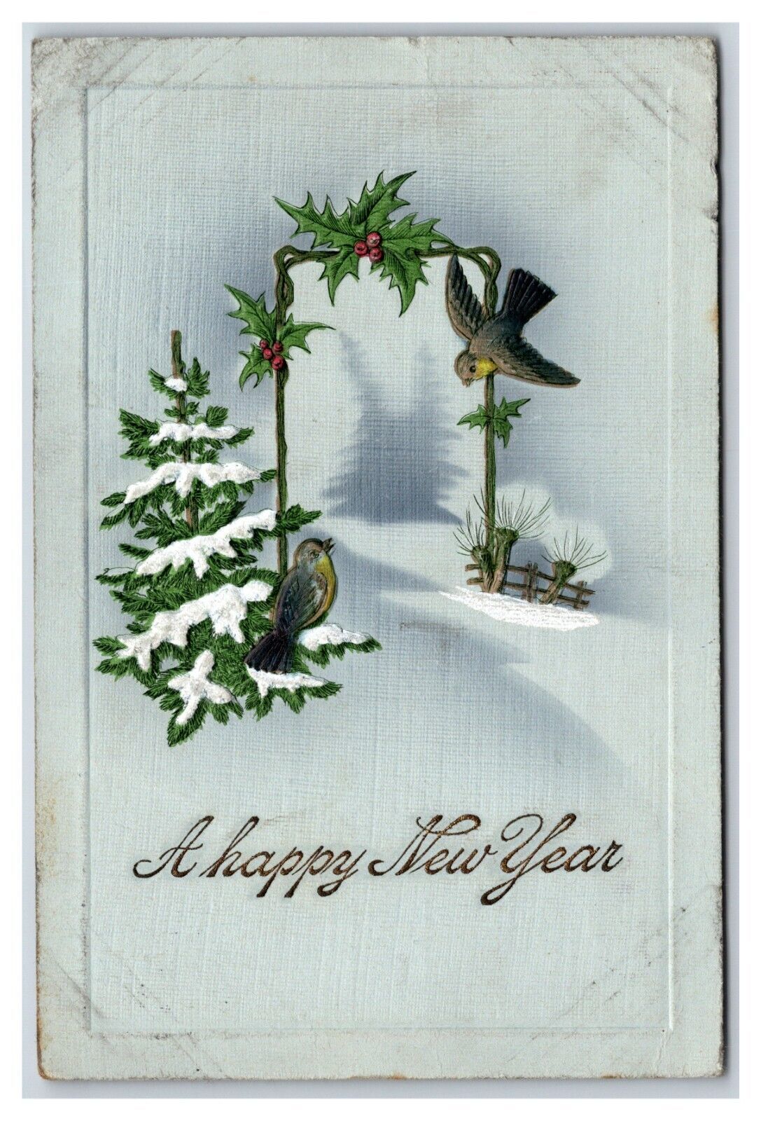 Happy New Year Doorway Pine Tree Sparrow Hoilly Embossed DB Postcard U17
