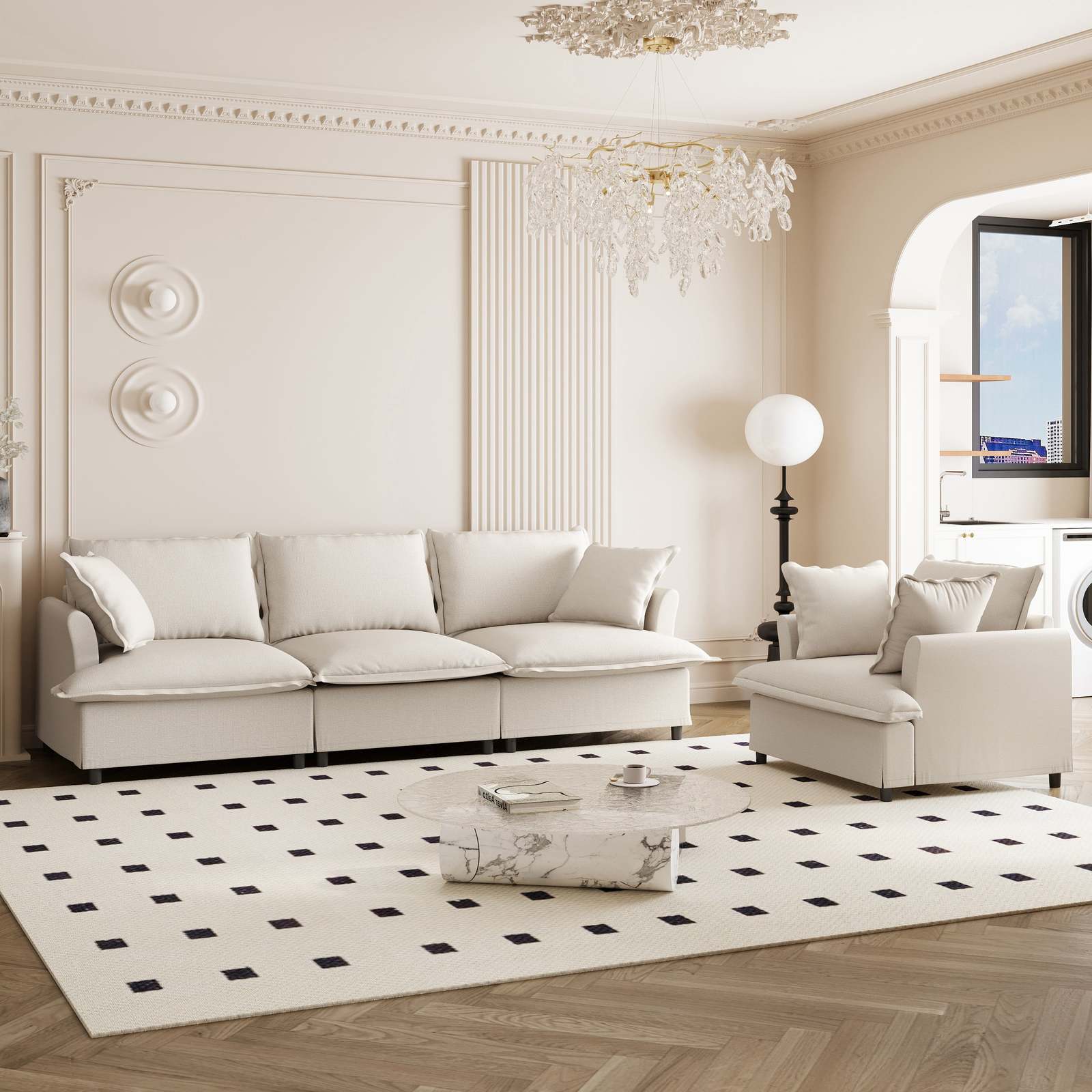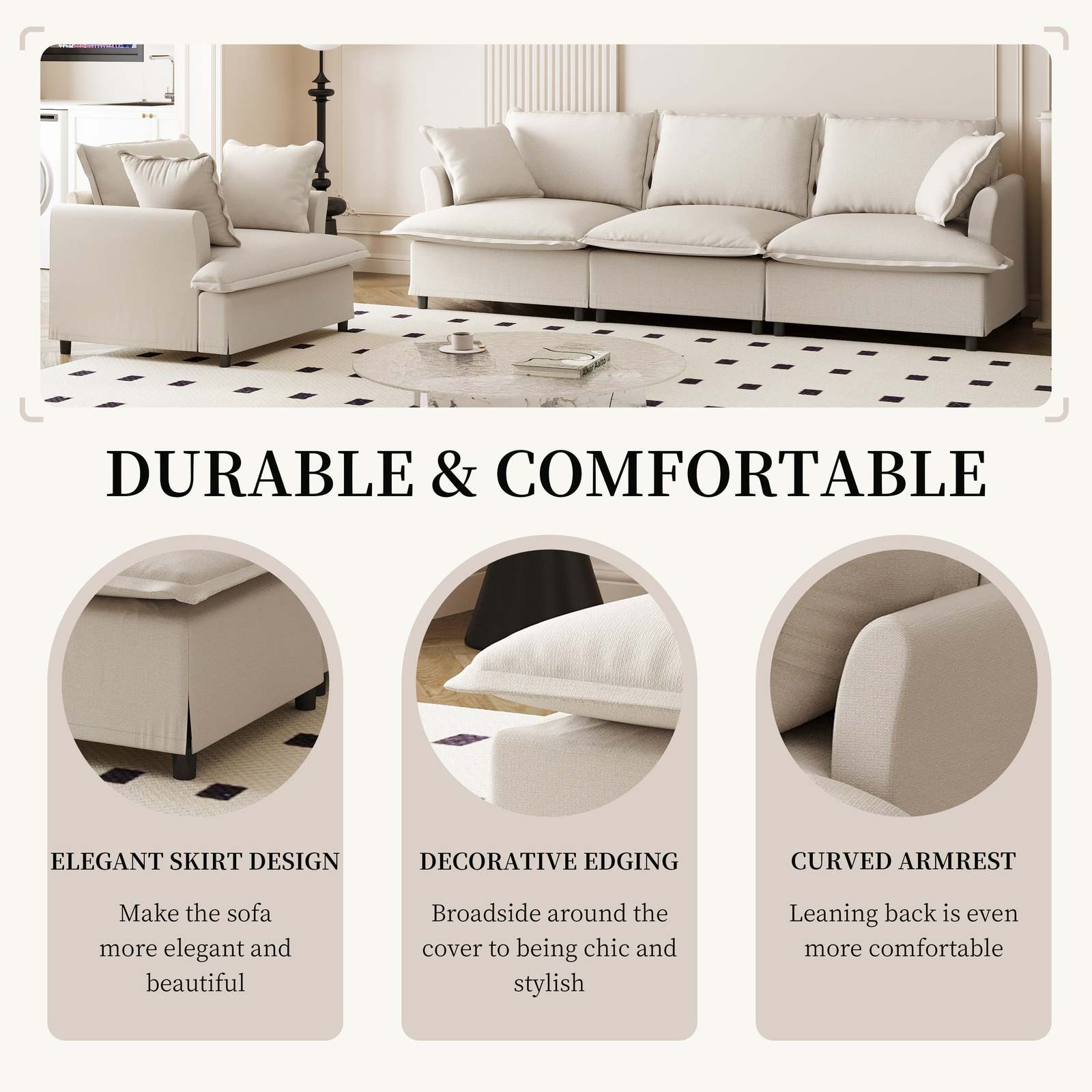 Discover endless possibilities with our modular sofa! Featuring three movable modules?three-seater, single seat, and ottoman?you can easily customize the layout to fit any space. Need more? Simply purchase additional modules as needed. Perfect for various room sizes and interior styles, its elegant skirted seat design and petal-shaped armrests bring a touch of sophistication to your home. Enjoy versatile, stylish comfort with our adaptable, modular design!