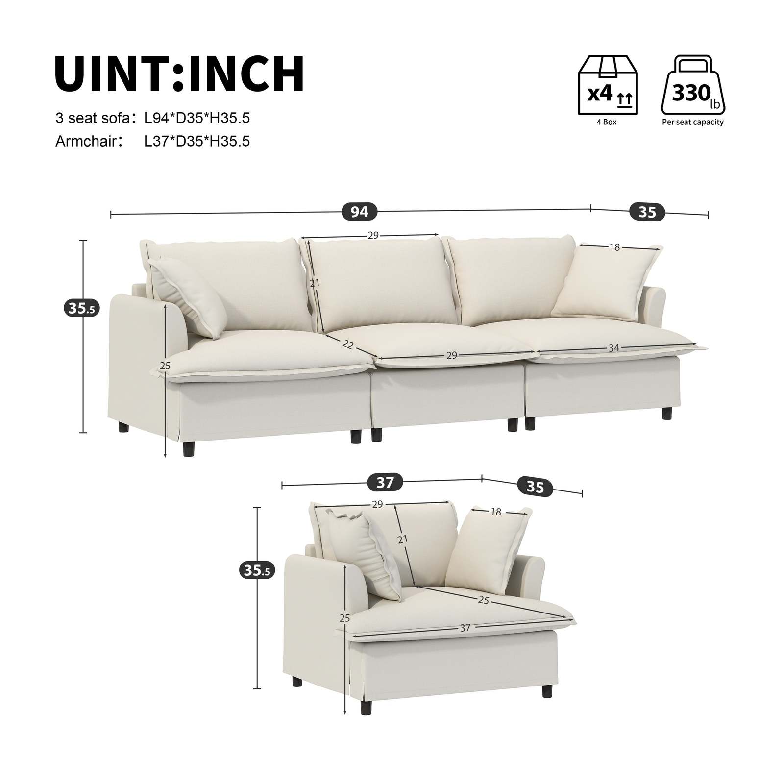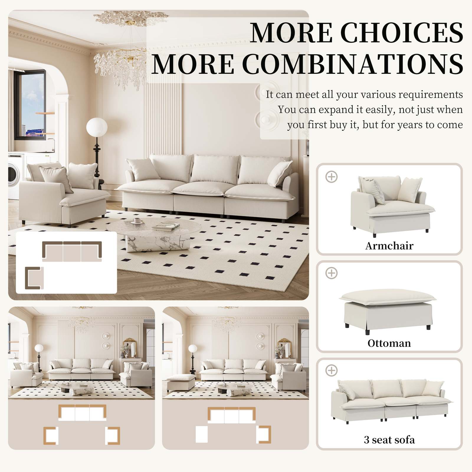 Modular Design: The sofa features a versatile modular design, consisting of three key pieces: 1 three-seater and armchair. These modules can be freely combined to create various seating arrangements, allowing you to customize the layout to suit your specific space. Additionally, individual modules can be purchased separately, giving you the flexibility to expand or adjust the configuration as needed.