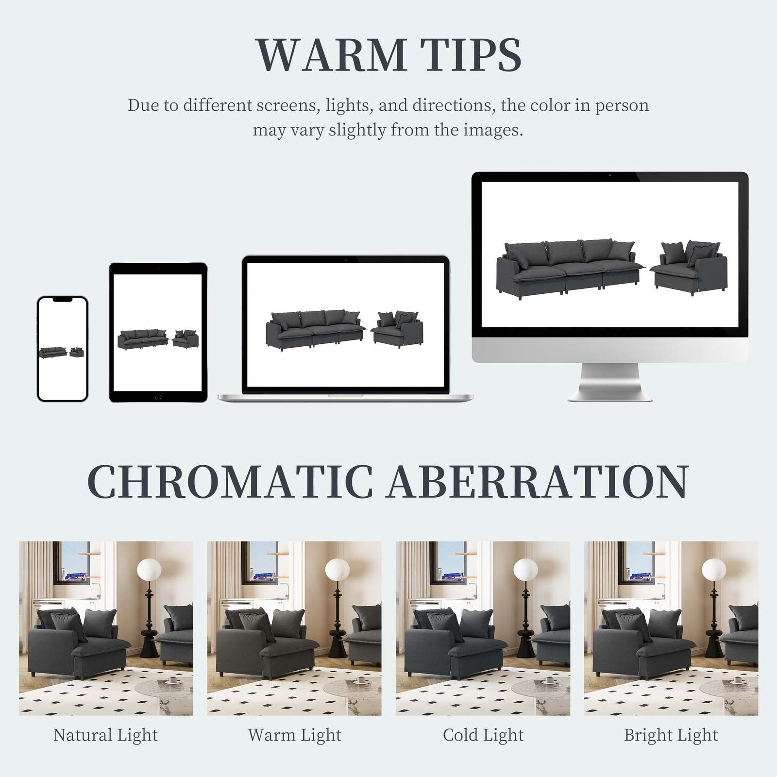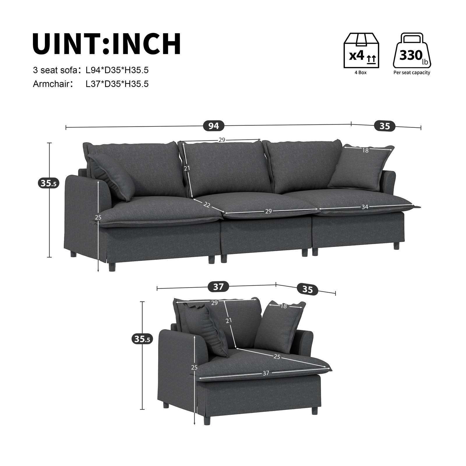 Modular Design: The sofa features a versatile modular design, consisting of three key pieces: 1 three-seater and armchair. These modules can be freely combined to create various seating arrangements, allowing you to customize the layout to suit your specific space. Additionally, individual modules can be purchased separately, giving you the flexibility to expand or adjust the configuration as needed.