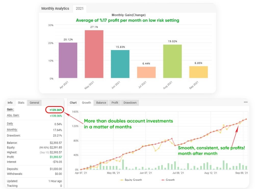 Experts Advisor has proven performance, including 139% profit in 5 months (verified on Myfxbook), offering steady monthly returns of 18–30% on medium risk settings all in a hands-free, done-for-you format.