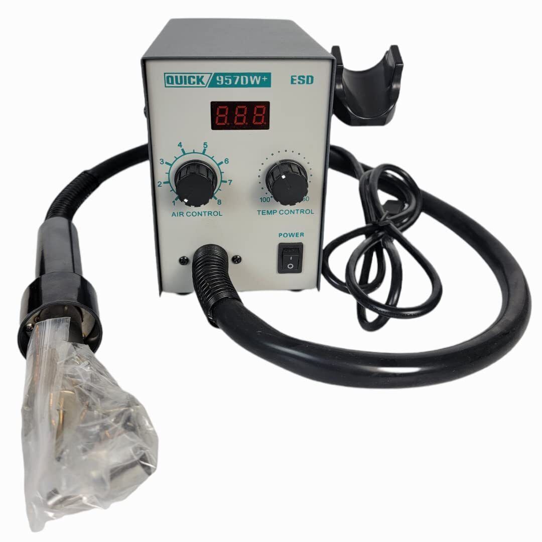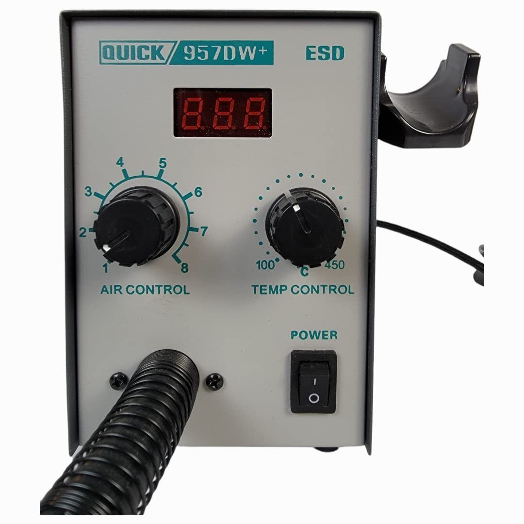 Quick 957DW+ Hot Air Station (580 Watt)The Quick 957DW+ is a 580 watt hot air station. The 957DW+ has two knobs on its front panel for adjusting temperature and airflow, and an easy to read LED screen displaying the current temperature. It has a maximum airflow of 50L / min, and a maximum temperature of approximately 840degrees-F.The 957DW+ has a sensor inside the handle which activates the station when the handle is picked up. This makes the station easier to use, and along with auto cooling, also prolongs the life of the heater.