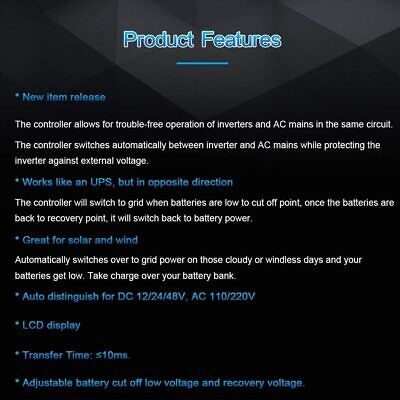 ?Beneficial to Solar or Wind System?: On cloudy or windless days when your battery gets low, it will automatically switch to grid power, protect your battery. ?Works like an opposite direction UPS?: The ATS controller will switch to grid power when batteries votagle are lower than cut off point,it will switch back to battery power when the batteries votagle are higher than recovery point. ?Auto distinguish?: DC 12/24/48V,AC 100-120V 60HZ / 220-240V 50HZ auto distinguish.User can define the Cut-Off and Recovery Voltages.Recovery voltage must be higher than Cut-off voltage. Battery type: Suitable for Sealed,Gel,Lead-acid,Lithium battery and so on. as long as the voltage of your battery are within the voltage ranges in the followings.9-17V at 12V system;18-30V at 24V system; 30-60V at 48V system. ?Big Power?: 5.5kw(110V) or 11KW(220v),Fast Transfer time:Inverter transfer to public power ?10ms,public power transfer to inverter ?16ms. ?LCD display?: Battery real-time voltage;working status of public power,inverter and battery.?Note: The controller needs to connect the battery, powered by the battery and get battery power data.