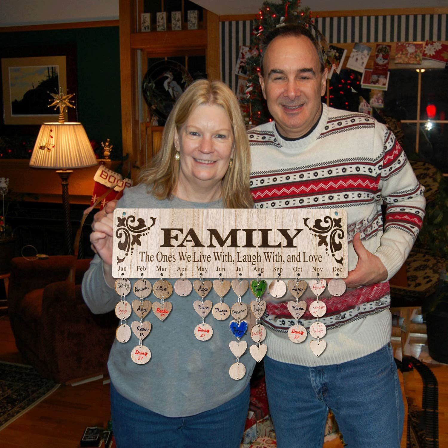 UNIQUE CHRISTMAS GIFTS - Great present for someone with large or growing family to keep track of all the family birthdays anniversaries. Best gifts present of parents (mothers /fathers) grandparents (grandmothers/grandfathers/grandpa) parents in law (mothers in law/fathers-in-law) stepparents (stepmothers/stepfather) for Birthday Christmas Mother's Day Father's Day Thanksgiving Day Anniversary from kids(daughter/son) grandkids (granddaughter/grandson). BIRTHDAY REMINDER CALENDAR - Great Way to Keep All Family Birthdays Anniversary?s Celebration Special Events Dates. Add the name and dates to wood discs or hearts with pen then hang it under the appropriate month. Dates at a glance! Never forget and miss again. Its a handy quick reference to look for birthdays of friends and relatives. ENJOY THE FAMILY WARM - It's a great time with family work together to DIY handmade. So enjoy it. As the same time it will be a good opportunity for you to accompany the kids and families. Grandparents hands-on teaching grandchildren assemble and paint to create belong himself family birthday calendar.Also cultivate their sense of accomplishment. WALL HANGING DECORATIVE PLAQUE - Beautiful wall hanging birthday organiser available for your house and office or classroom etc.wall decor. And add a touch of village style. DIY handmade project,easy to assemble.The wooden board and discs can hand-painted what you like color with multicolor chalk. Wooden disks also arbitrarily string out what you like shape. MATERIAL SIZE QUANTITY- Birthday reminder board and discs/tags are made with particle wooden.Board size:15.7 x 4.7x0.2 inch/ tags size:1.2 x 1.2 x 0.08 inch.And you will get:1x FAMILY sign Tracker Plaque, 50x Wooden Circles, 50x Wooden Hearts, 100x Assembly Ring, 1x Jute Twine.1 x adhesive hook.