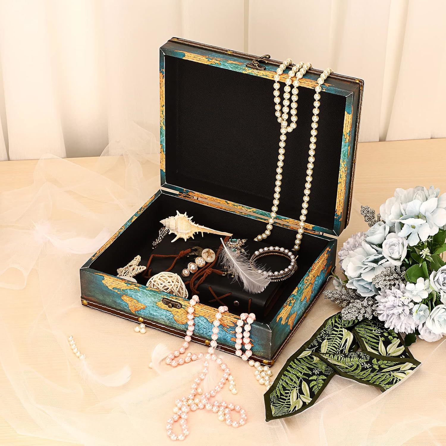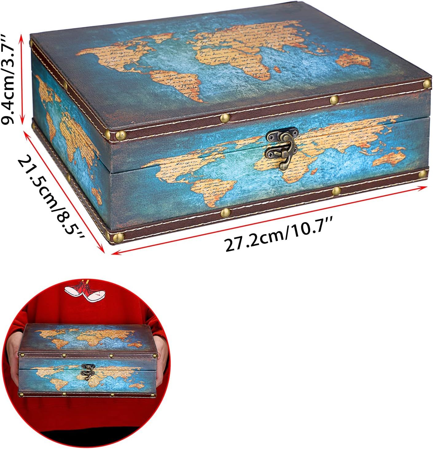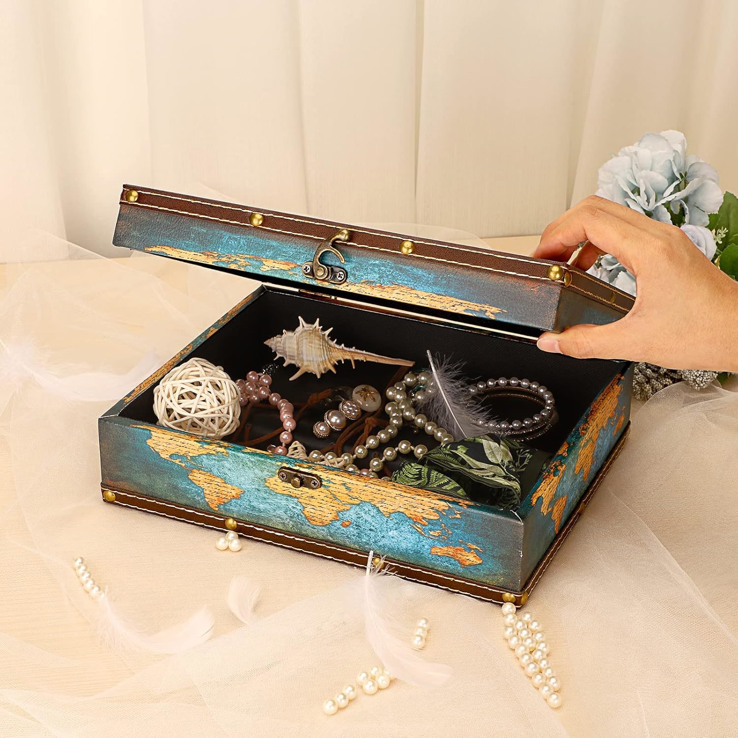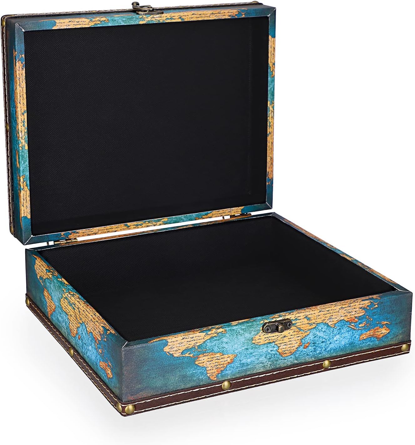 Artificial leather+Wood ?Product Info -Dimensions(LxWxH): 10.7" x 8.5" x 3.7"/27.2 x 21.5 x 9.4cm. It is perfectly sized to sit on your dresser without without taking up too much space. Packing included: 1 x Wooden Treasure Box (Accessories are not included.Please pay attention to the size before purchasing) ?Unique Vintage Design - This map decorative box box was made of premium wood and PU leather. Leather accents and vintage looking hardware add to the antique look.It is simple yet classic, applicable for any occasions ?Storage Display -This treasure chest box is perfect for organize greeting or wedding cards, envelops, stamps, photos or pictures, donate cash or tips, world coins, jewelry, sea shells and other accessories.Perfect can be used as a pirate treasure chest, treasure hunting and fun adventures with the kids. ?Multipurpose - As great storage, display and decorative addition to bedroom, dresser, countertop, etc.The vintage wooden box can also be used as card box, jewelry box, keepsake box, decorative box, gift box, wishing well box, donation ballot box, suggestion box, collection box,memory box etc ?Great Gift Idea - This vintage jewelry box is an ideal gift for someone you love on birthday, wedding, anniversary, valentine's day, women's day, mother's day, thanksgiving, christmas, housewarming, etc.What are you waiting for, give her/him a surprise